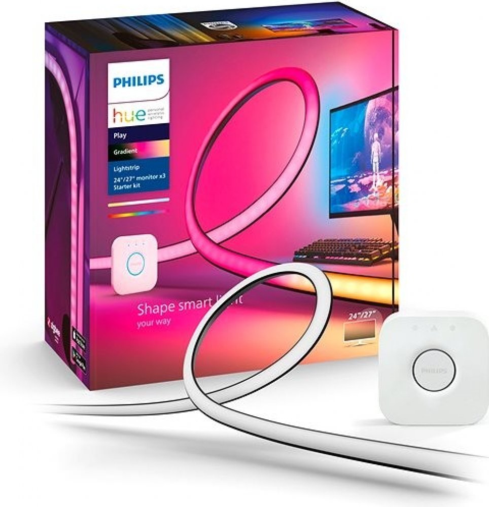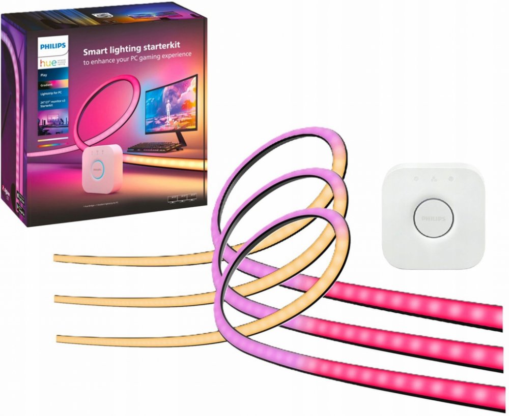 Osvětlovací páska Philips Hue Gradient PC s funkcí stínování barev vyžaduje mobilní aplikaci Hue Sync pro synchronizaci s obsahem zobrazeným na obrazovce a můstek Hue Bridge. Můstek Hue Bridge umožňuje vybudovat vícesystémovou instalaci inteligentního domu s možností spolupráce a automatizace zařízení v rámci jedné společné aplikace Philips Hue. Umožňuje také přidat maximálně 50 světelných bodů a příslušenství v celém domě, vytvářet počítadla a plány a ovládat světlo odkudkoli – zevnitř domu i mimo něj – pomocí aplikace Hue.