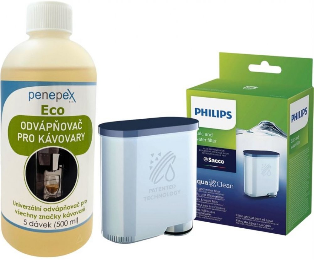 Sada pro dokonalou údržbu vašeho kávovaru PhilipsDopřejte svému kávovaru prvotřídní péči s praktickým setem, který kombinuje originální vodní filtr Philips AquaClean CA6903/10 a ekologický univerzální odvápňovač Penepex Eco 500 ml. Společně tvoří dvojici, která prodlouží životnost vašeho přístroje, usnadní jeho pravidelnou údržbu a zlepší chuť připravované kávy.Co sada obsahuje Philips AquaClean CA6903/10 – filtr do kávovaru (1 ks) Originální filtry účinně odstraňují nečistoty a snižují obsah chlóru ve vodě, čímž chrání kávovar před usazováním vodního kamene a zachovávají plnou chuť kávy. Penepex Eco – univerzální ekologický odvápňovač 500 ml Profesionální tekutý odvápňovací přípravek od české značky Penepex. Šetrný k přírodě, ale spolehlivý pomocník v boji proti vodnímu kameni. Odvápňovač na bázi kyseliny mléčné bezpečně vyčistí vnitřní části kávovaru bez rizika jejich poškození a bez nepříjemného zápachu. Proč právě tuto sadu Kompletní péče – filtr i odvápňovač v jednom balení pro snadnou údržbu. Dlouhá životnost přístroje – prevence vodního kamene i mechanického opotřebení. Lepší chuť kávy – čistá voda je základem výrazného aroma a plné chuti. Ekologické řešení – odvápňovač na přírodní bázi, bezpečný pro domácnost i životní prostředí. Technické údaje Philips AquaClean CA6903/10: Pokud je přístroj vybaven funkcí AquaClean, uvidíte na nádobě na vodu speciální nálepku. Životnost: 5000 šálků kávy, nebo 3 měsíců užívání. Vodní filtr je pod produktovým označením Saeco Philips AquaClean CA6903/10, CA6903/00, CA6903/01, CA6903/22 (jedná se však o tentýž výrobek). Seznam kávovarů kompatibilních s filtrem Philips AquaClean CA6903/10: Moltio - HD8768 / HD8769 / HD8777 / HD8778 / HD8869 / HD8886 Intuita - HD8779 / HD8880 / HD8881 Minuto - HD8780 / HD8861/ HD8862 / HD8865 Syntia - HD8833 / HD8836 / HD8837 / HD8838 / HD8839 Energica - HD8852 Exprelia - HD8859 / HD8858 Intelia - HD8880 / HD8887 / HD8900 / HD8902 / HD8904 / HD8906 Incanto - HD8911 / HD8912 / HD8913 / HD8914 / HD8915 / HD8916 / HD8917 / HD8918 / HD8919 / HD8921 / HD8922 / HD9712 Royale - HD8920 / HD8930 PicoBaristo - HD8924 / HD8925 / HD8927 / SM3061 Xelsis - HD8943 / HD8944 / HD8946 / HD8953 / HD8954 / RI9943 / RI9944 / RI9946 / SUP038 / SUP038Z Grand Baristo - HD8975 / HD8977 / HD8978 Odea - RI9753 / RI9754 / RI9755 Odea Talea - RI9826 Syntia - SUP037R / SUP037DR / SUP037DRJ PHILIPS - EP5363/10, EP5334/10 (Series 5000 LatteGo), EP2230/10, EP2224/40, EP2231/40 (Series 2200 LatteGo), EP3550 3100 Series / EP3551 3100 Series / EP4010 4000 Series / EP4050 4000 Series, EP5961 5000 Series / EP5960 5000 Series / EP5361 5000 Series / EP5360 5000 Series.Další varianty pro údržbu kávovaru PhilipsPokud hledáte jiné kombinace filtrů a odvápňovače, podívejte se na další varianty sad pro údržbu kávovaru. Najdete zde například sety s různým počtem filtrů nebo jiným typem příslušenství, aby péče o váš kávovar byla vždy co nejjednodušší.Součástí balení je Philips AquaClean CA6903/10 filtr do kávovaru (1ks) a Penepex Eco univerzální odvápňovač 500 ml.