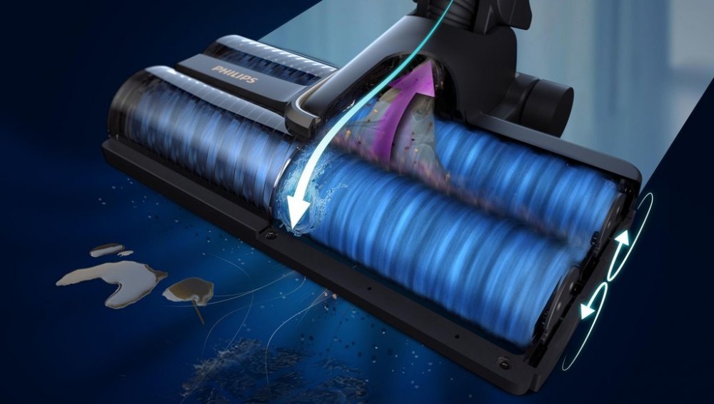 Tyčový vysavač s motorem dole, baterie Li-Ion, hubice AquaSpin, samočisticí a poúklidová stanice, čisticí kartáče, podlahový vysavač