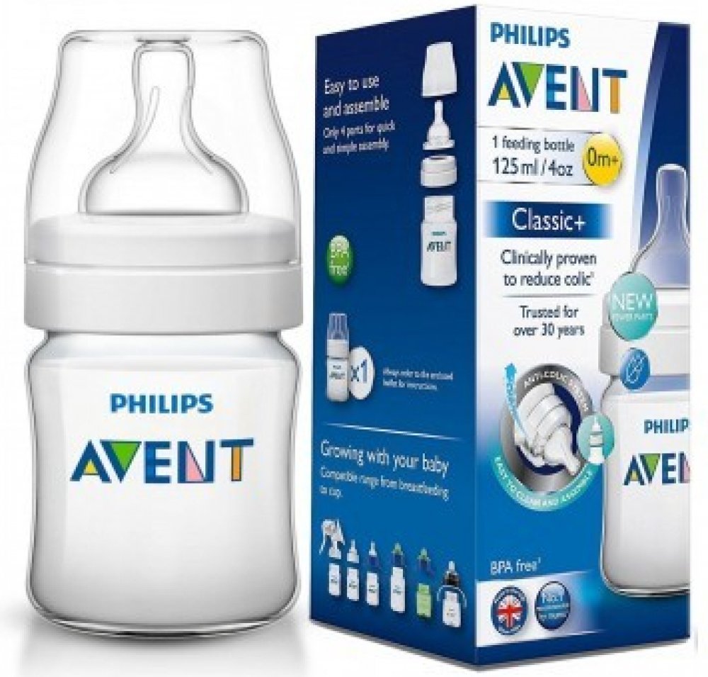 Antikoliková láhev AVENT. Jedinečný pružný okraj dudlíku umožňuje při krmení proudění vzduchu do láhve a nikoliv do bříška dítěte. Dítě si samo kontroluje tok mléka, stejně jako u přirozeného kojení.