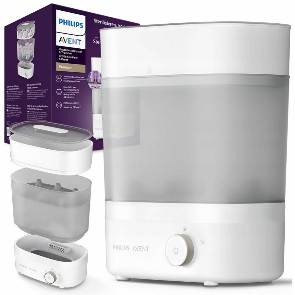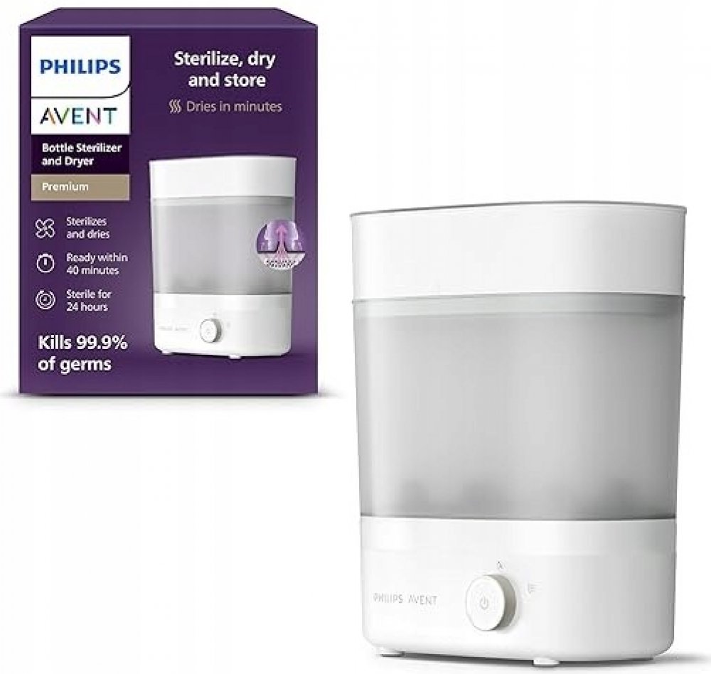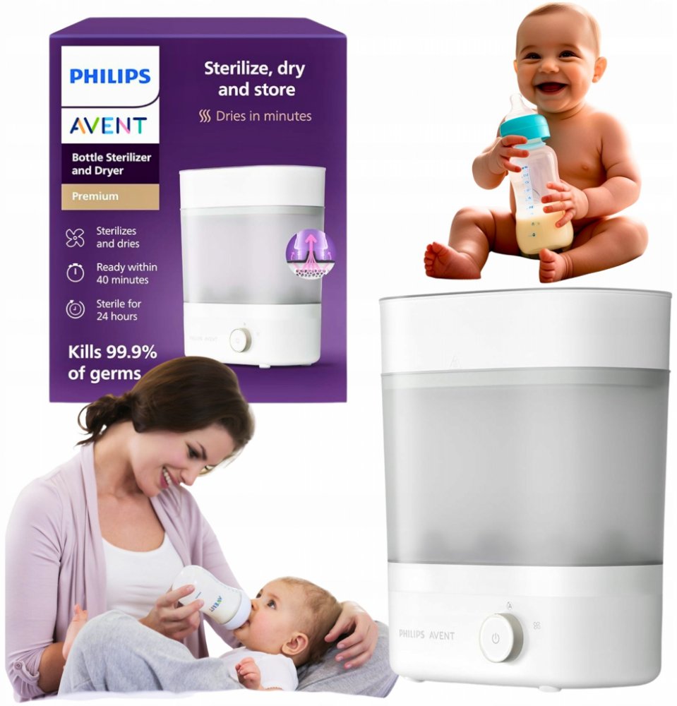 Připravte se na další krmení dítěte za 40 minut. Sterilizátor a vysoušeč lahví Premium používá k sušení lahví před vypnutím trysky filtrovaného vzduchu. Sterilizátor je rychlý a hygienický a zničí 99,9 procent bakterií, abyste mohli být při každém krmení v klidu.