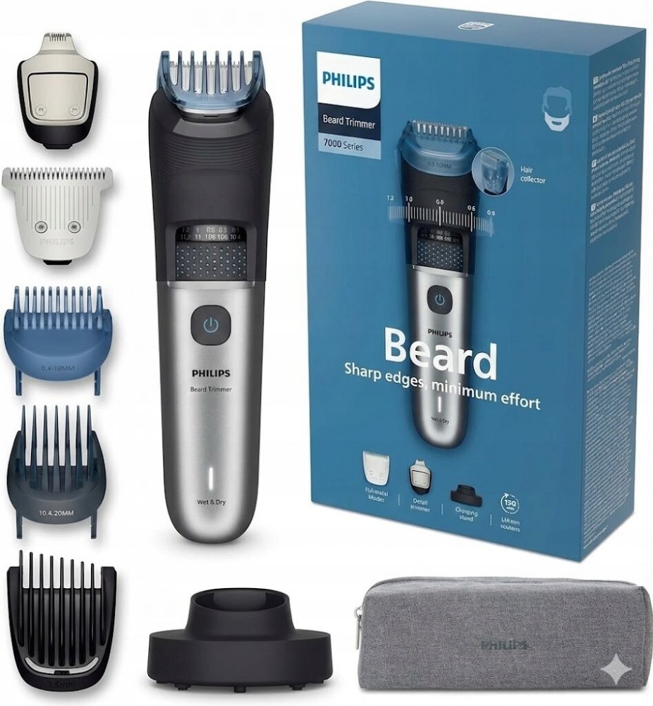 Zastřihovač vousů Philips řady 7000 – samoostřící kovové čepele, 40 nastavení délky, technologie BeardSense, uchopovač vlasů, 100% voděodolnost, široký zastřihovač, model BT7670/15
