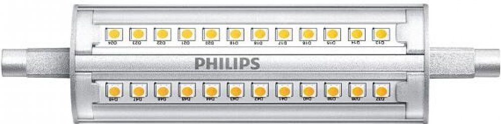 Stmívatelná LED žárovka Philips CorePro LEDlinear MV v délce 118 mm se dvěma paticemi R7s má příkon 14 W a nahrazuje klasický 100 W lineární halogenový zdroj. Svítí teplým bílým světlem 3000 K se světelným tokem 1600 lm v širokém úhlu 300°.