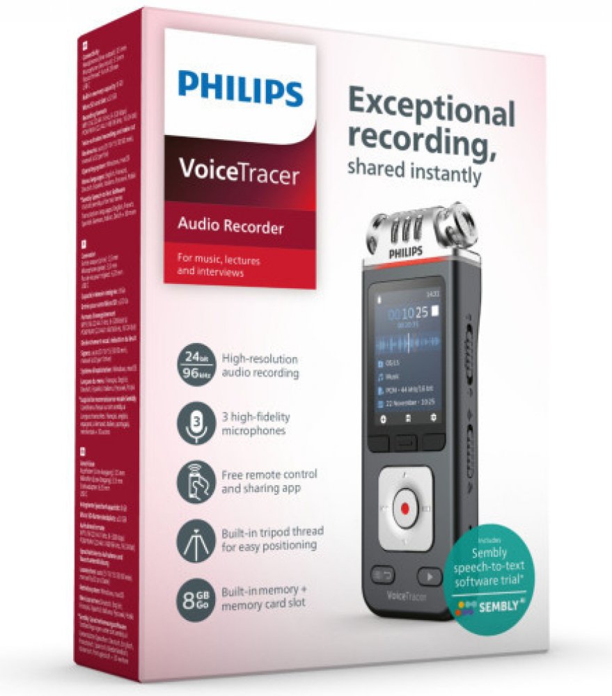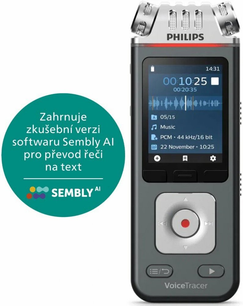Shrnutí hlavních benefitů: Tři kvalitní mikrofony pro studiový záznam hudby i řeči Podpora Wi-Fi a aplikace pro dálkové ovládání 8 GB paměti + slot microSD až 32 GB Převod řeči na text pomocí AI softwaru Sembly Barevný displej a hlasově aktivované nahrávání Výdrž až 36 h na jedno nabití Philips DVT6115 je digitální diktafon, který nabízí záznam ve špičkové studiové kvalitě 24bit/96kHz. Tento model je ideální pro hudebníky, studenty i profesionály, kteří potřebují zaznamenávat přednášky, schůzky nebo rozhovory s co nejvyšší věrností. Diktafon Philips DVT6115 je vybaven trojicí vysoce kvalitních mikrofonů, které zachytí každý detail i jemný tón. Technologie nahrávání je uzpůsobena pro hudbu, řeč i schůzky. VoiceTracer obsahuje přednastavené zvukové scény podle účelu nahrávání, od poznámek přes hudbu až po rozpoznávání řeči. Nahrávky jsou uloženy ve formátu MP3 nebo WAV. Interní paměť 8 GB je rozšiřitelná pomocí microSD až do 32 GB. Přes konektor USB-C lze přístroj snadno nabíjet a využít výdrž baterie až 36 hodin. Využití v praxi je velmi univerzální. Na přednášce položíte diktafon ke zdroji zvuku, ovládáte jej mobilem pomocí aplikace. Při hudebním záznamu využijete vysoký poměr signál/šum a potlačení šumu z držení. Při schůzce oceníte funkci hlasové aktivace a převod mluveného slova na text. Výsledné soubory lze sdílet a přepisovat přes cloudový software Sembly. Používání je snadné a intuitivní. Díky přehlednému barevnému displeji a uživatelskému rozhraní v češtině ovládnete vše bez složitostí. Aplikace VoiceTracer umožní dálkové ovládání přes mobil. Doporučuje se používat originální příslušenství, jako je stativ nebo ochranné pouzdro. Baterii plně dobijete za tři hodiny. Philips DVT6115 je výkonný diktafon s profesionálními funkcemi. Zachytí hudbu, řeč i schůzky ve vysoké kvalitě, umožní přepis mluveného slova na text a nabídne dálkové ovládání. Ocení ho každý, kdo chce zaznamenat každý detail a mít pořádek v nahrávkách. Objednejte si ještě dnes a získejte nástroj pro precizní záznam! Objednávejte pod kat. číslem Phil-DVT6115