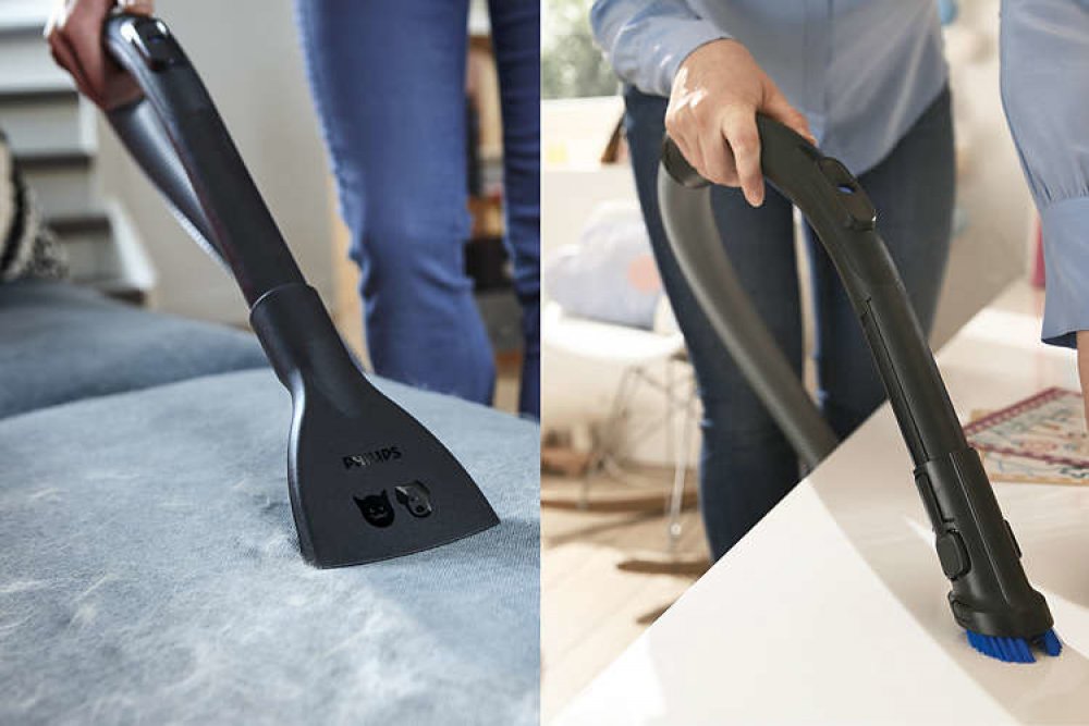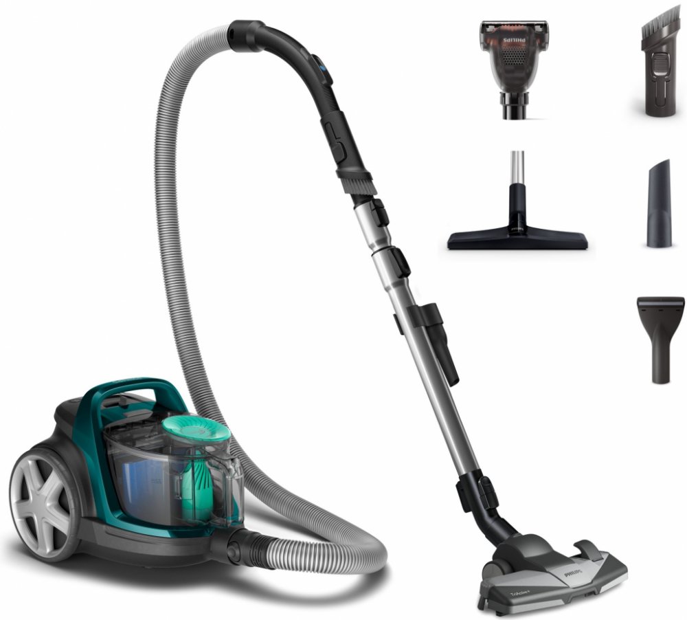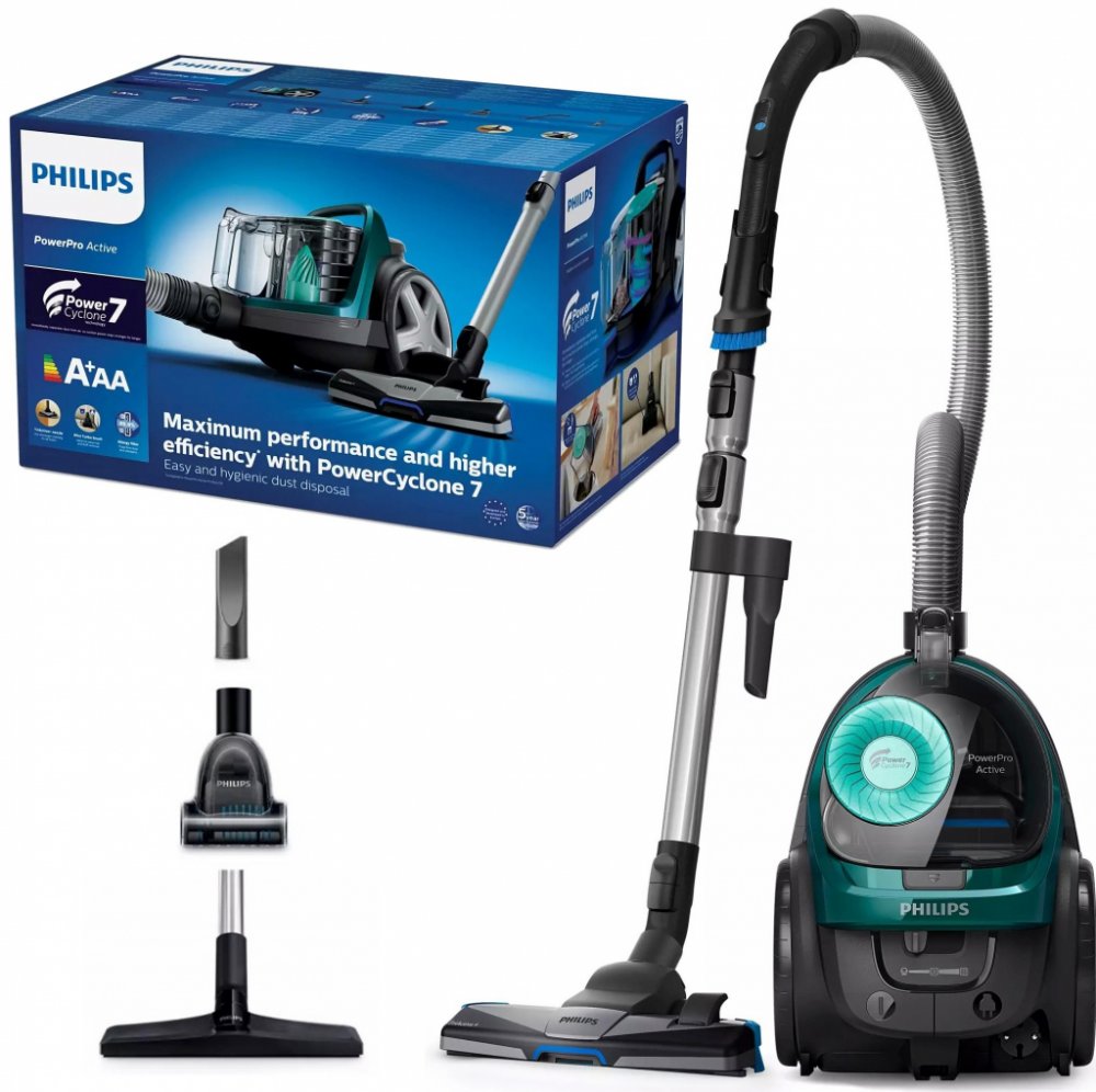 Vysoký výkon díky energetickému hodnocení A+ Zkonstruováno k dosažení plného výkonu při energetické účinnosti s hodnocením A+, účinnosti A při čištění tvrdých podlah a třídy A zpětných emisí prachu. Technologie PowerCyclone 7 udržuje sací výkon po delší dobu Aerodynamický design technologie PowerCyclone 7 minimalizuje odpor vzduchu a zajišťuje výjimečný čisticí výkon ve 3 vysoce účinných krocích: 1) Vzduch proudí do systému PowerCyclone ve velké rychlosti díky přímému a hladkému vstupu. 2) Zaoblené vedení zrychluje vzduch směrem nahoru do cyklonové komory. 3) Ve vrchní části cyklonu výstupní lopatky efektivně oddělí prach od vzduchu. Vlastní hodnocení výkonu společnosti Philips, podrobnější informace na adrese www.philips.com/performance-rating Hubice TriActive+ zajistí vysoký výkon na všech typech podlah Hubice TriActive+ aplikuje během vysávání 3 činnosti najednou: 1) Jemně otevírá koberec speciálně navrženou plochou, aby odstranila prach, který se skrývá hluboko v koberci. 2) Vysává velké kousky nečistot větším otvorem v přední části. 3) Pomocí kartáčů na obou stranách odstraňuje prach a špínu podél nábytku a stěn. Funkce Power control pro přizpůsobení sacího výkonu Funkce Power control upraví sílu sání pro různé typy úklidu, např. pro tvrdé podlahy, dřevěné podlahy a měkká čalounění. Kompaktní design s držadlem vpředu a nahoře pro snadné přenášení Držadlo nahoře a vpředu pro snadné přenášení. Kompaktní design umožňuje pohodlné skladování. Měkký kartáč uložený v rukojeti, vždy připravený k použití Nástavec pro stírání prachu je vestavěný přímo do rukojeti, a je tak možné jej kdykoli použít na nábytek, ploché povrchy nebo čalounění. Rotující Mini Turbo kartáč pro snadné odstranění chlupů a chomáčů prachu Mini Turbo kartáč rychle odstraňuje chlupy (zvířecí), chomáče a prach z pohovek, polstrování a dalších tkanin. Tento kartáč je ideální pro majitele domácích mazlíčků. Prachová nádoba navržená pro hygienické vyprazdňování jednou rukou Prachová nádoba je navržena pro hygienické odejmutí a vyprázdnění jednou rukou, což pomáhá omezit na minimum oblaka prachu. Systém protialergického filtru zachytí více než 99,9 % jemného prachu Náš systém vzduchového filtru zajišťuje dokonalé utěsnění a zachytí 99,9 % jemného prachu – včetně pylů, chlupů domácích zvířat a roztočů – což ocení alergici a lidé s vyššími nároky na hygienu.