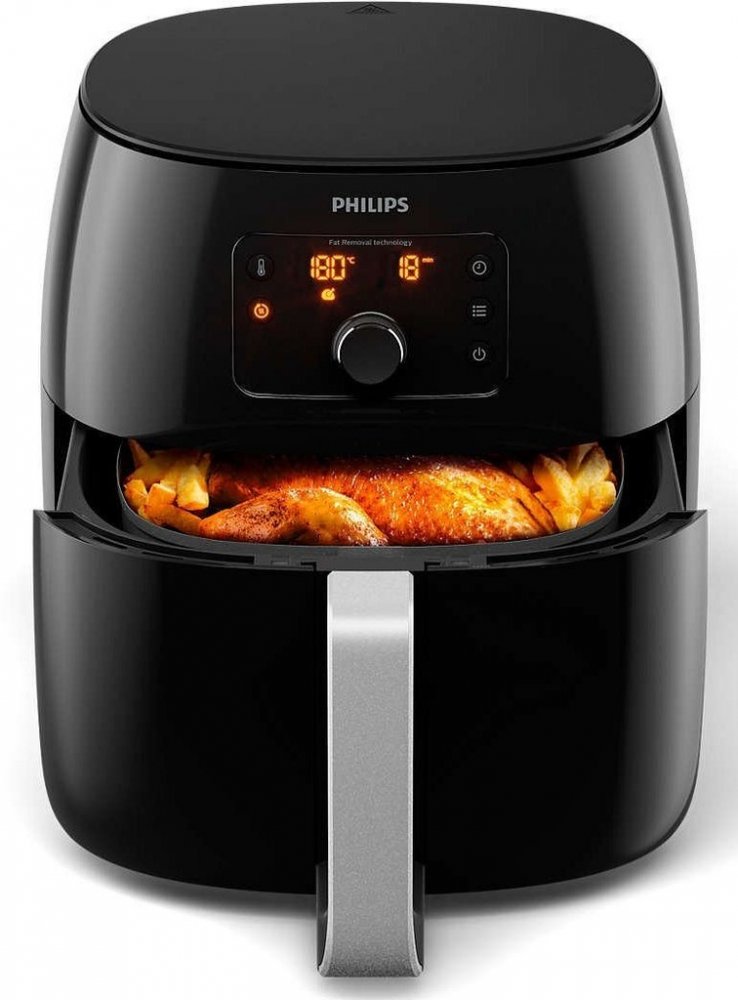 Smažte s minimem oleje nebo bez přidaného oleje Fritéza Airfryer využívá k přípravě vašich oblíbených jídel horký vzduch a jen malé množství přidaného oleje nebo žádný olej, takže můžete smažit s množstvím tuku nižším až o 90 %*. Vychutnávejte si skvělé křupavé pokrmy, které chutnají jako dobře prosmažené, ale obsahují minimum tuku. Technologie Twin TurboStar odstraňuje z potravin tuk Kombinací výkonného ohřívače a motoru s naší novou technologií Twin TurboStar se horký vzduch ve fritéze Airfryer točí jako silné tornádo, které prochází celým košíkem. Přístroj je navržen tak, aby z jídla extrahoval více tuku, zachytil jej do redukční nádoby na tuk, která umožňuje jeho snadnou likvidaci. Fritéza Philips Airfryer s technologií Twin TurboStar také v porovnání s běžnou fritézou váš domov nezaplní zápachem přepáleného oleje. Porovnání obsahu tuku u kuřete oproti fritéze využívající smažení na tuku a smažení ve woku V porovnání s čerstvými hranolky připravenými v běžné fritéze Philips V porovnání s tradiční fritézou Philips Smažte, pečte, grilujte a restujte svá oblíbená jídla doma Fritéza Airfryer XXL zvládne mnohem víc než jen smažení. Grilujte, pečte i opékejte svá oblíbená jídla a připravujte rychlé, chutné pokrmy pro celou rodinu. Naše aplikace Philips Airfryer přináší spoustu tipů, návodů a jednoduchých receptů. Režim udržování teploty zajistí pružný čas servírování Díky funkci udržování teploty můžete jídlo podávat, až budete připraveni. Pokrm vydrží teplý až 30 minut. Brožurka s recepty obsahuje více než 30 chutných jídel Od rychlých zdravých svačinek po jídla pro celou rodinu: naše knížka receptů zdarma obsahuje více než 30 nápadů na chutná jídla a jednoduché pokyny od profesionálních šéfkuchařů. Naše aplikace Philips Airfryer přináší spoustu tipů, návodů a jednoduchých receptů. Digitální displej s 5 přednastavenými programy přípravy jídla Digitální rozhraní s přednastavenými programy na přípravu jídel, které umožňují jedním stiskem tlačítka usmažit zmrazené hranolky, připravit maso, rybu a kuřecí paličky, se snadno používá. Volič QuickControl nastaví teplotu i dobu přípravy. Funkce udržování teploty vám dává možnost pružně servírovat tehdy, až budete připraveni. Košík QuickClean s nepřilnavou mřížkou vyčistíte za 90 sekund Košík QuickClean fritézy Airfryer má vyjímatelnou nepřilnavou mřížku, která se snadno čistí. Košík i vyjímatelná zásuvka s nepřilnavou vrstvou jsou vhodné do myčky – a smažení vzduchem váš domov nezaplní zápachem jako tradiční smažení. Všechny odnímatelné součásti jsou vhodné do myčky Abychom vám ušetřili čas a umožnili bezproblémové čištění, jsou všechny odnímatelné součásti vhodné do myčky na nádobí.