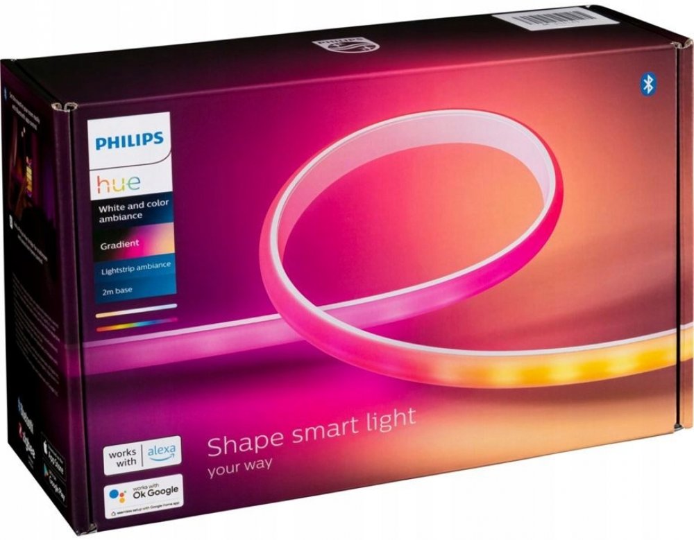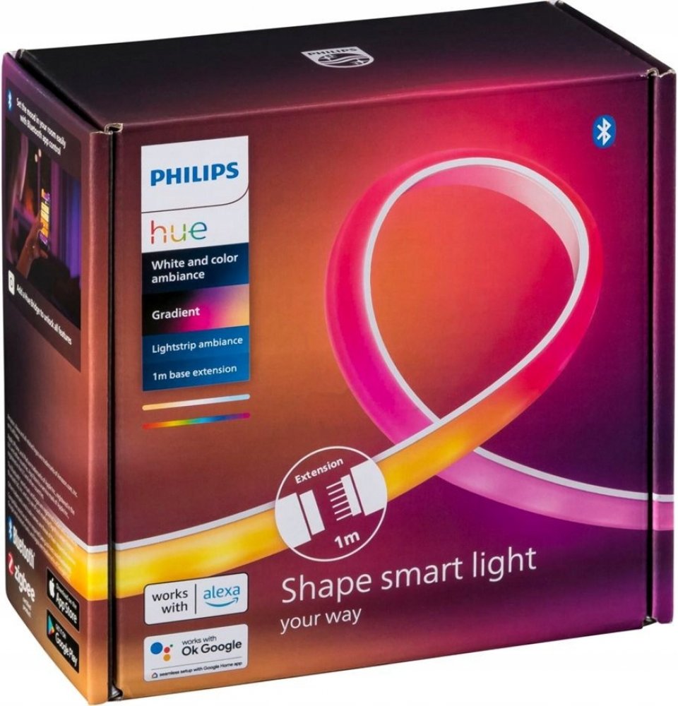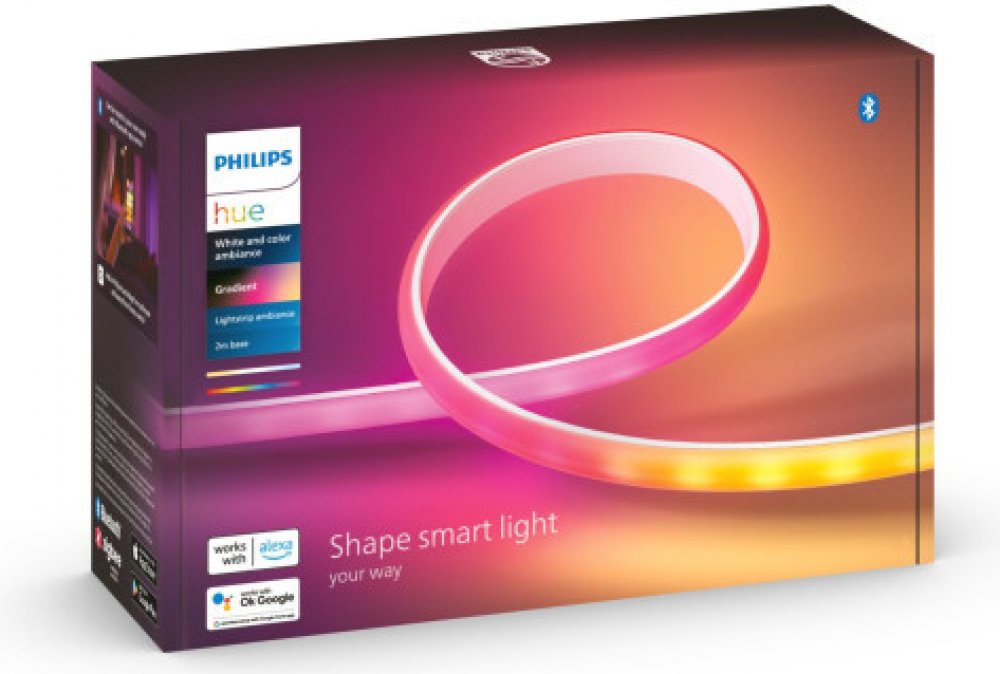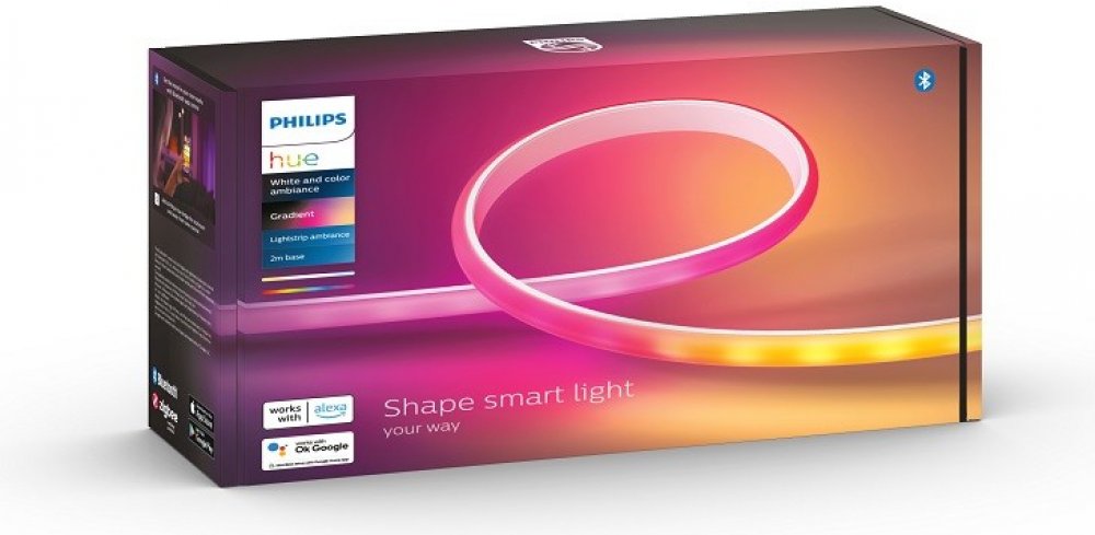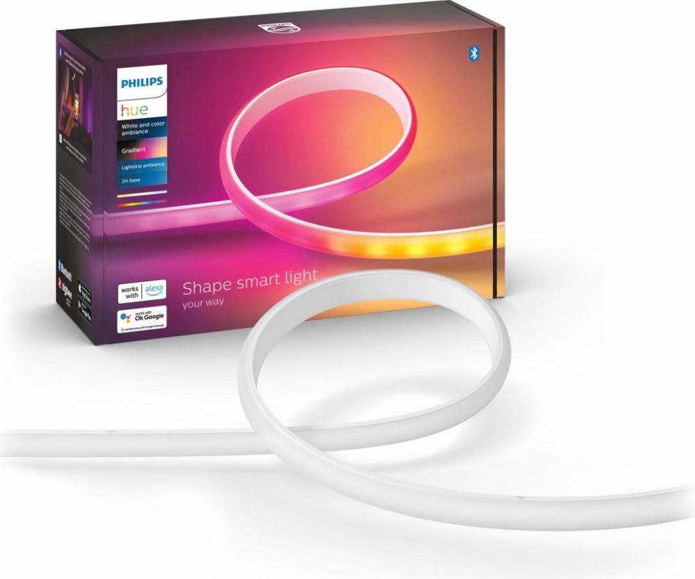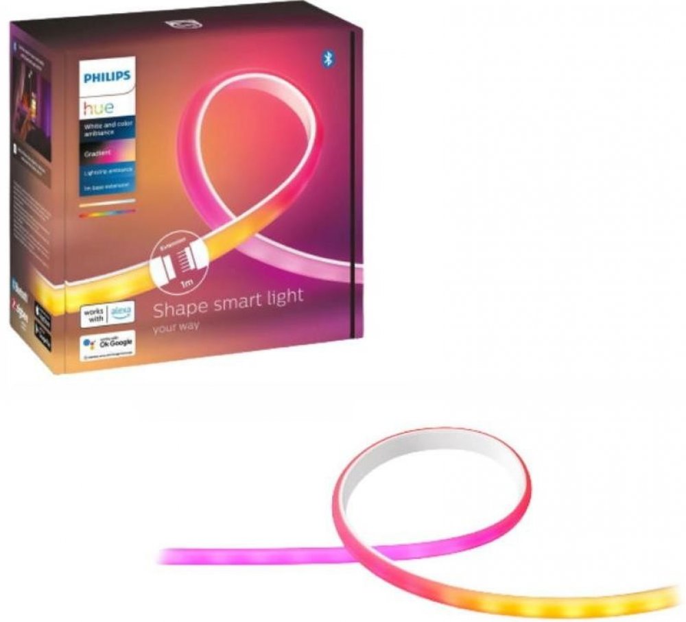 Inteligentní LED pásek HUE uznávaný a respektovaný v oboru osvětlení Philips. Páska vybavená napájením 20W a velmi účinný světelný výkon - 1800 lm, vyzařuje teplé příjemné a relaxační světlo, s 16 milionů barev RGB i širokou paletu bílého světla, s nimiž můžeme vytvořit náladu vhodnou pro každou příležitost. Gradient HUE byl navržen speciálně pro efekt rozptýleného světla, a pouzdro s matnou povrchovou úpravou poskytuje hladký, plynulý gradientní efekt, který snižuje odrazy. Kromě kontroly světla v celé teplotní škále baru má pásek funkci okamžité stmívání. Páska dokáže míchat více barev najednou a může být prodloužit až na 10 metrů. Po připojení k aplikaci HUE umožňuje měnit barvy, vytvářet vlastní přechody a využívat mnoho dalších možností.