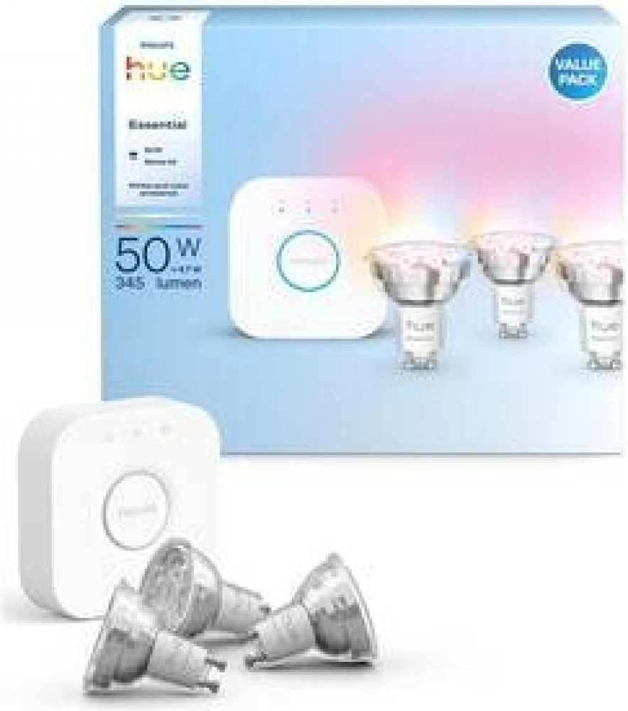 LED žárovka • startovací sada • závit/patice: GU10 • spotřeba energie: 4,7 W • svítivost: 345 lumenů • barevná teplota: studená bílá • index podání barev (CRI): 80 Ra • tvar: bodová • stmívatelná • kompatibilní s Philips Hue • Amazon Alexa • Apple HomeKit • Google Home • Tuya • energetická třída F