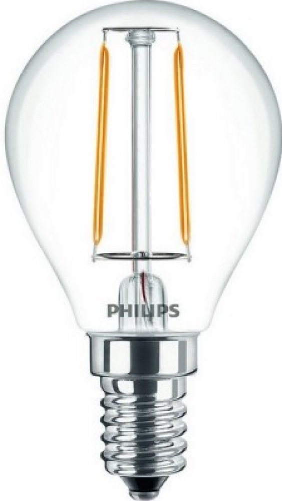 LED filament žárovka Philips CorePro LEDluster s paticí E14 a skleněnou čirou baňkou ve tvaru kapka P45 o příkonu 2 W nahrazuje obyčejnou 25W žárovku. Viditelná rovná vlákna podtrhují vintage styl a vydávají nestmívatelné krásné teplé bílé světlo 2700 K.