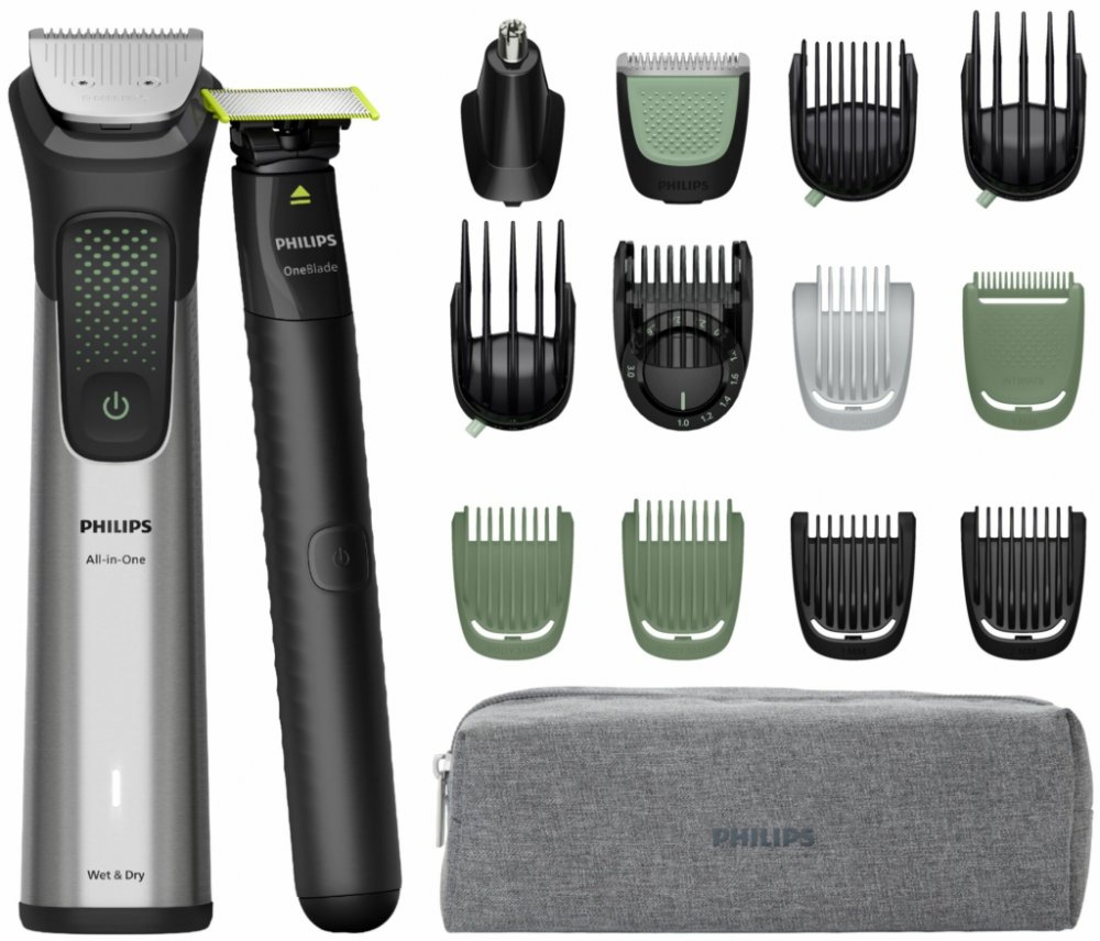 nejdůležitější příslušenství: hřeben pro přesné zastřihování, 3 nastavitelné hřebeny na vousy a vlasy (3–7; 9–13; 16–20 mm), 2 hřebeny na tělo (3 a 5 mm), 2 hřebeny na strniště (1, 2 mm), nástavec na obočí, nástavec na obočí, nástavec na obočí, měkké pouzdro se zipem