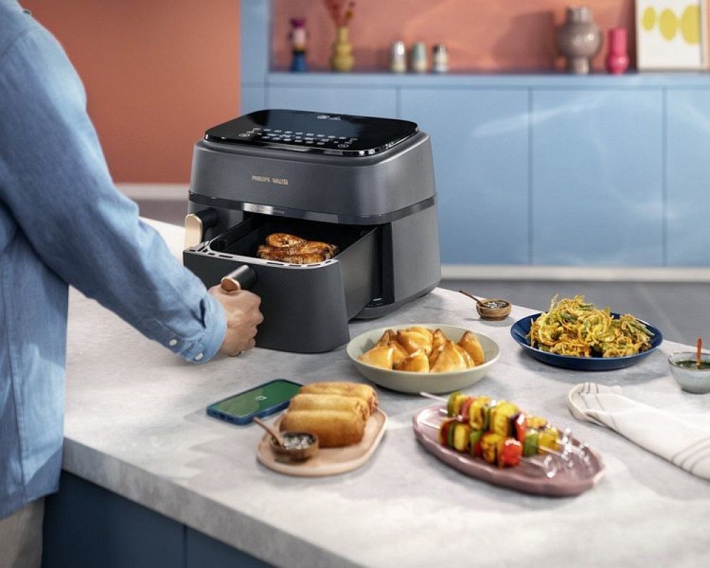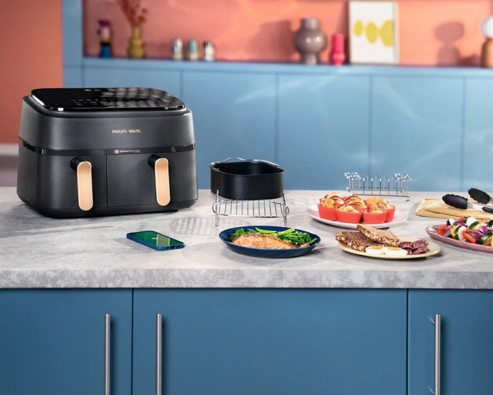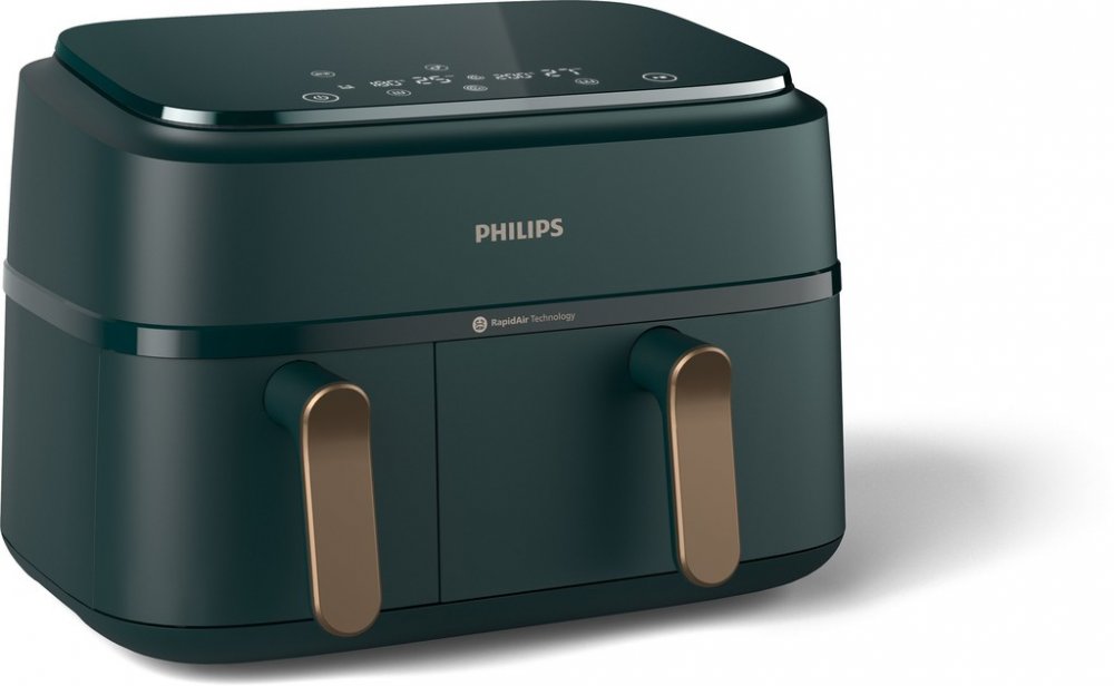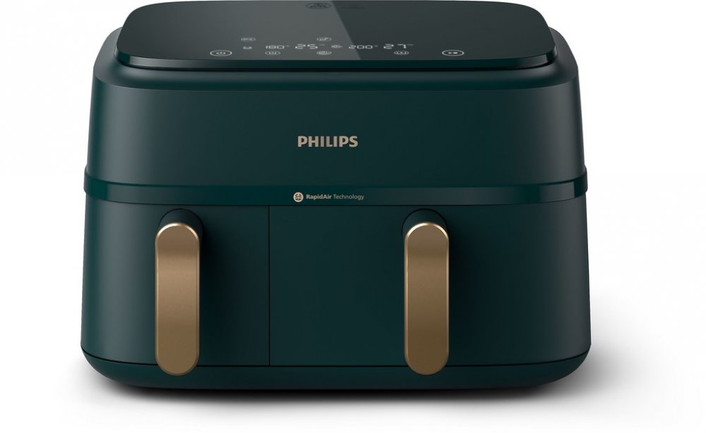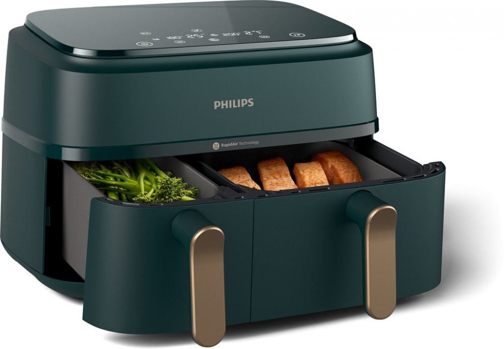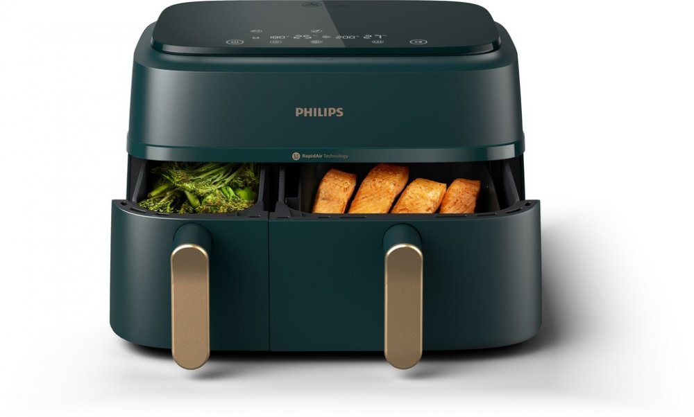 Fritéza Philips Airfryer z řady 3000 se dvěma košíky zajistí, že oba pokrmy budou horké a připravené najednou. Užívejte si chutné a zdravé vaření s velkým košíkem na hlavní jídla pro celou rodinu a menším košíkem na přílohy nebo jednotlivá jídla.