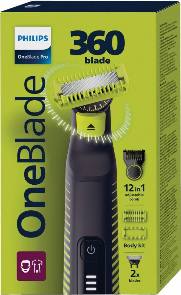 Philips OneBlade Pro 360 na tvář a tělo pro zastřihování, tvarování a oholení libovolně dlouhých vousů a pro zastřihování a holení všech částí těla. Oboustranný břit 360 s dvojí ochranou před pořezáním, vhodný i pro citlivou pleť. Navíc ochranný nástavec proti pořezání v citlivých oblastech. Hřebenový nástavec pro zastřihování s 12 nastaveními délky vousů (0,4 - 10 mm) a 1 nástavec na zastřihování...