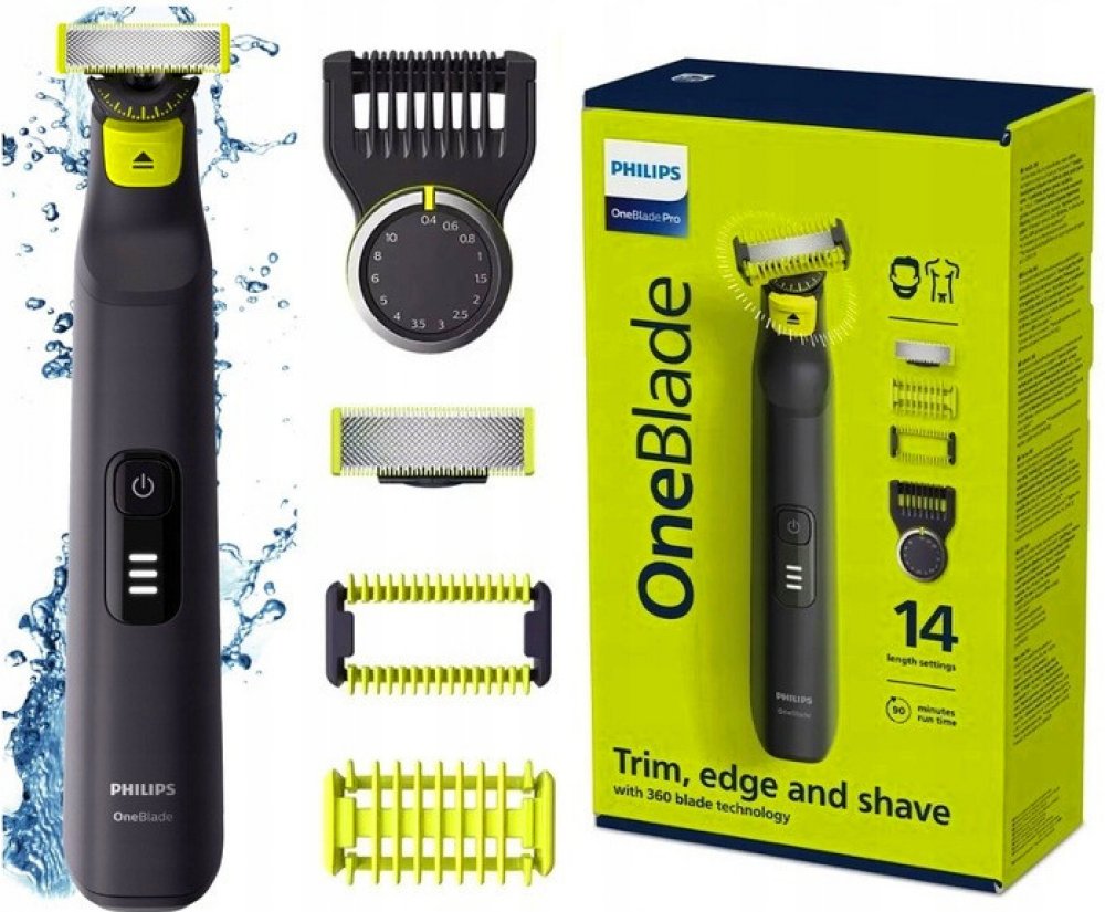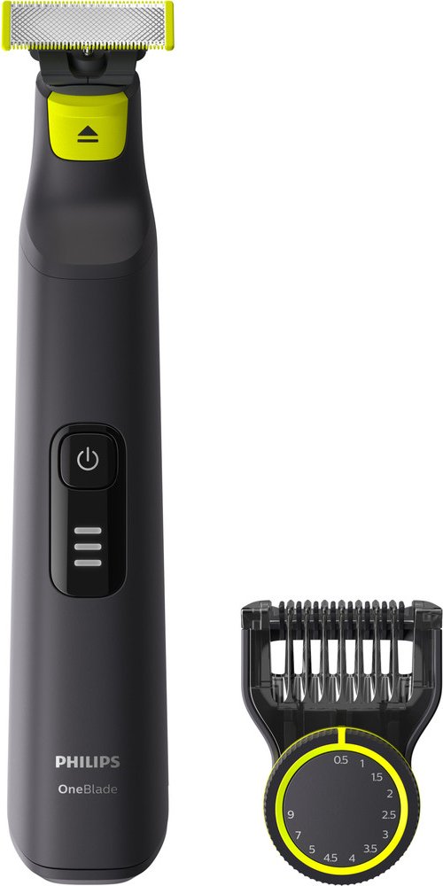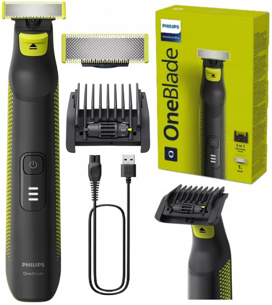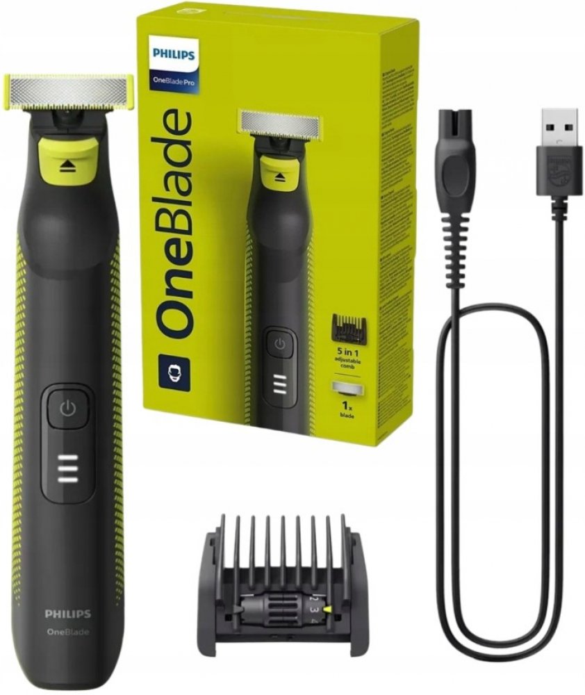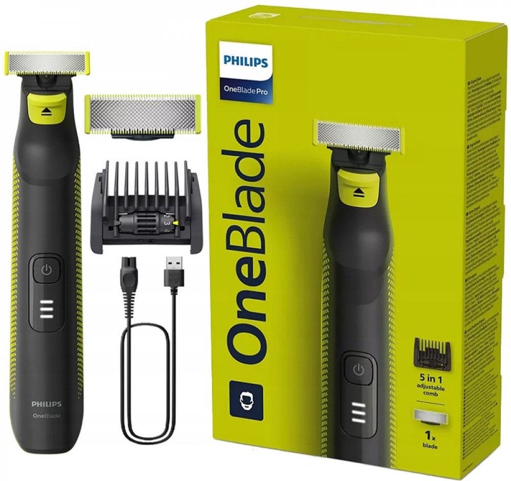 Philips OneBlade Pro dokáže vaše vousy upravit do jakéhokoliv tvaru. Má velmi přesný břit a hřeben s velkým výběrem nastavení délek, upraví tedy plnovous i třídenní strniště. Použití bez hřebenu je ideální pro oholení všech částí obličeje, a to bez tahání za vousy. Břity jsou mimořádně šetrné díky systému dvojité ochrany: hladkému povrchu, který zajišťuje plynulý pohyb po pokožce, a zaoblenému tvaru špiček pro maximálně šetrné používání. Mimořádný výkon Philips OneBlade zaručuje rychle se pohybující ostří, které vykoná až 200 pohybů za vteřinu. Přístroj má Li-iontovou baterii, po hodině dobití vydrží v provozu 90 minut. Aktuální stav baterie signalizuje LED kontrolka.