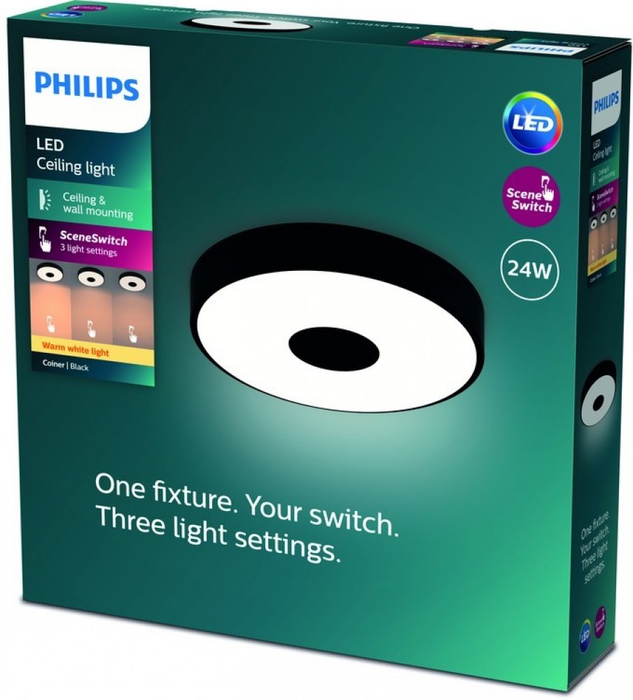 Máte v plánu modernizaci světel v domácnosti? Se stropním světlem Philips určitě každého příjemně překvapíte. Jeho jednoduchý moderní styl navíc nenuceně splyne s designem vašeho domova. Produkt přináší světlo o chromatičnosti 2700 K. Stropní světlo svítí s intenzitou 2700 lm. Ptáte-li se na technické specifikace, tak se připravte na to, že potřebuje příkon 24 W. Za zmínku stojí stupeň krytí IP20. Tudíž je nejvhodnější umístění v interiéru. Světlo patří do energetické třídy E. Při jeho výrobě byl použit kvalitní materiál, jímž je kov a plast. Zásadní parametry stropního světla Philips Coiner stropní svítidlo LED 24 W, 2700 K, SceneSwitch černé Stropní světlo Philips je vhodné pro použití v interiéru K jeho zhotovení byl použit materiál, jímž je kov a plast Světlo spadá do energetické třídy E Disponuje chromatičností 2700 K Příkon stropního světla Philips je 24 W Světelný tok má hodnotu až 2700 lm