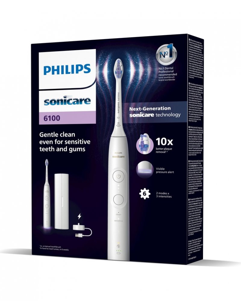 Balení obsahuje: 1 sonický kartáček Philips Sonicare 6100, 1 hlavice Philips Sonicare Sensitive, nabíjecí základna, cestovní pouzdro.