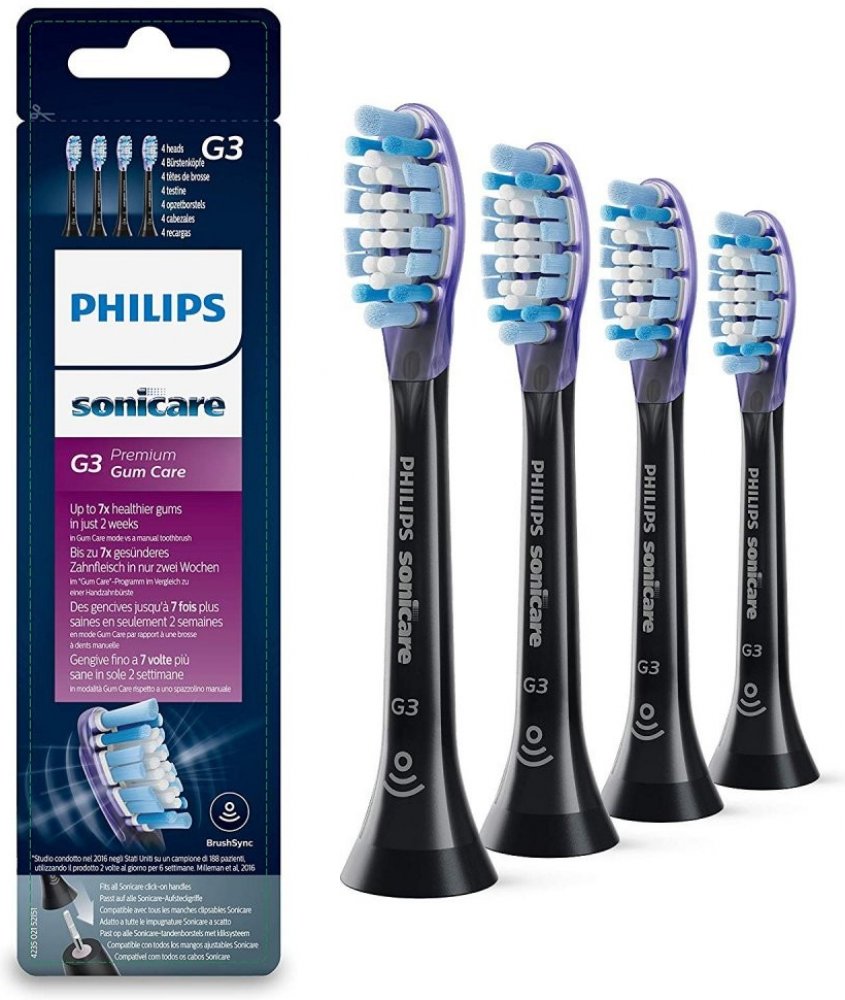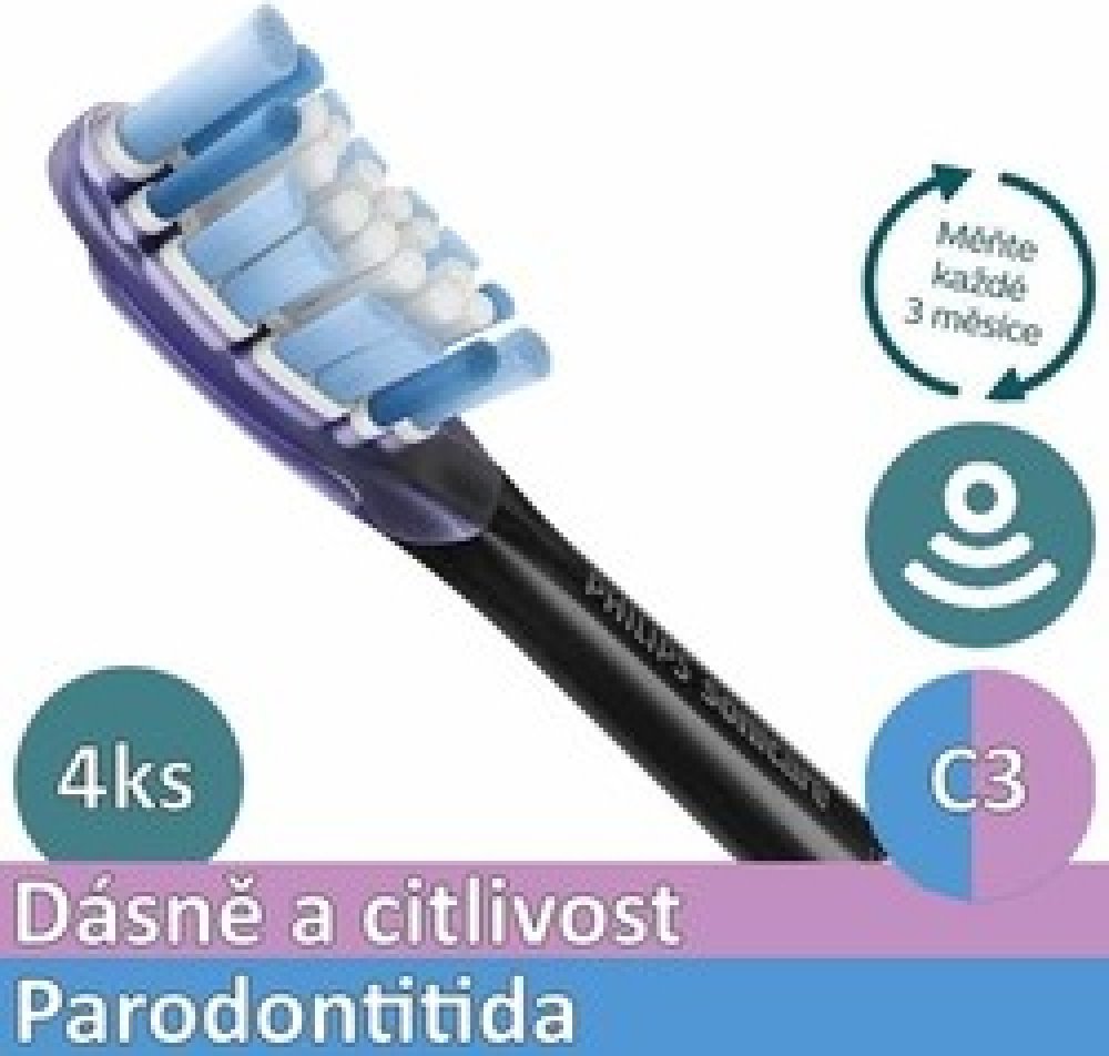 Philips Sonicare G3 Premium Gum Care je sada 4 náhradních hlavic navržených pro šetrnou a efektivní péči o dásně. Měkké štětiny a ohebné gumové boky zvyšují kontakt s okrajem dásně až 2×, díky čemuž hlavice odstraňují až 10× více plaku a přispívají k až 7× zdravějším dáskám za 2 týdny. Hlavice mají Click‑on uchycení, indikátor opotřebení (modré štětiny blednou) a rozpoznání hlavy pro optimalizované párování s kompatibilními rukojeťmi. Doporučená výměna je po 3 měsících; 75 % plastu v hlavici je bio‑based a obal je recyklovatelný.