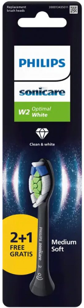 Hlavice Philips Sonicare Optimal White. Standardní velikost hlavice s průřezy vláken ve tvaru diamantového brusu je vyvinuta pro efektivnější odstranění pigmentů z povrchu zubů. Odstraňuje až 7x více plaku než manuální kartáček. Pro optimální výsledky měňte hlavice každé 3 měsíce. Hlavice jsou kompatibilní se všemi modely kartáčku Philips Sonicare 3. generace. Černá barva. Balení obsahuje 3ks.