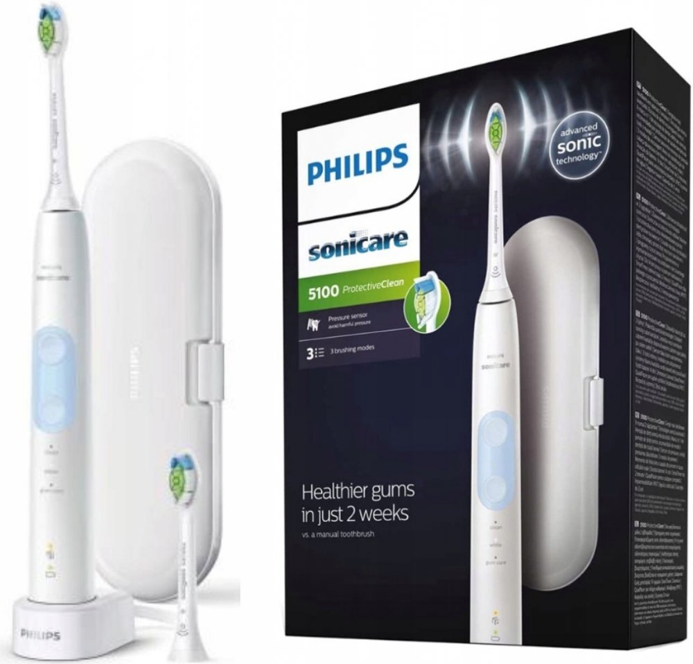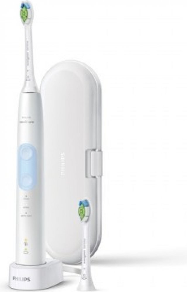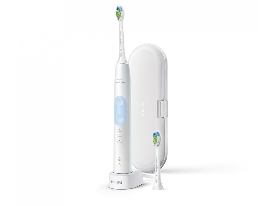 Elektrický zubní kartáček sonický, 62000 jemných pohybů/min, 3 režimy čištění: Clean, Gum Care a White, časovač, tlakový senzor a indikátor baterie, počet hlavic v balení: 2 ks, BrushSync - automatické upozornění na potřebu výměny hlavice, balení obsahuje: 1 kartáček ProtectiveClean, 2 hlavice Optimal White Standard, 1 nabíječka, 1 cestovní pouzdro, barva: bílá a světle modrá.