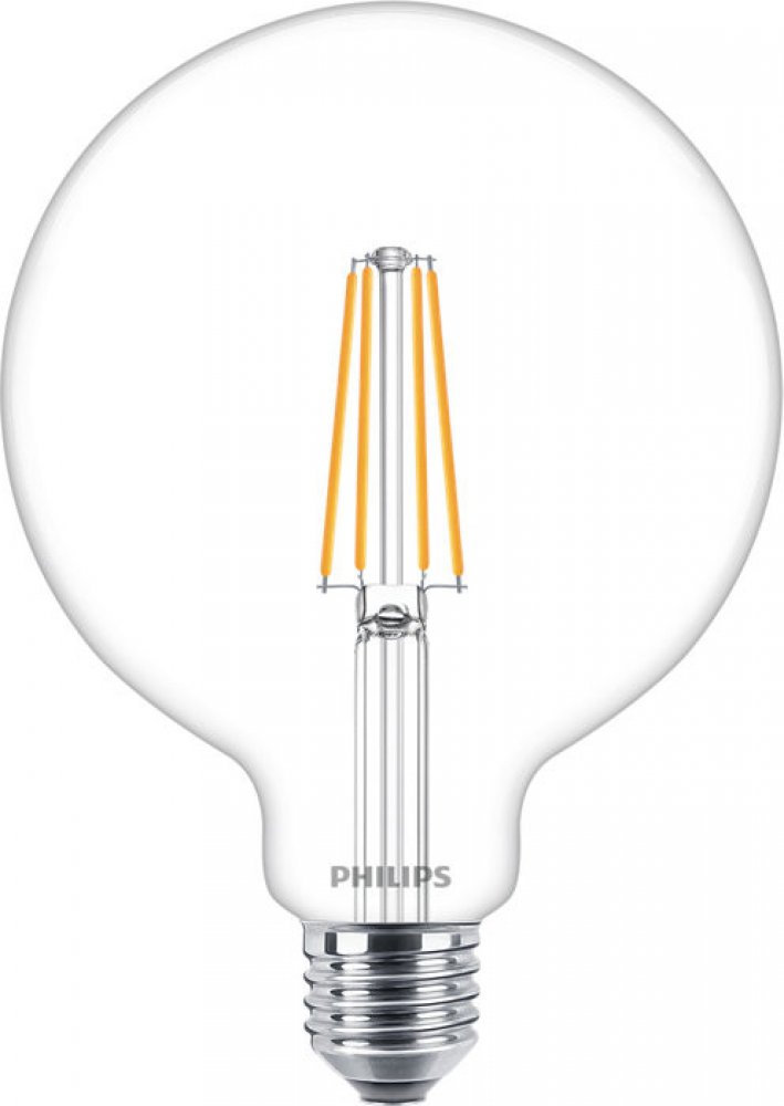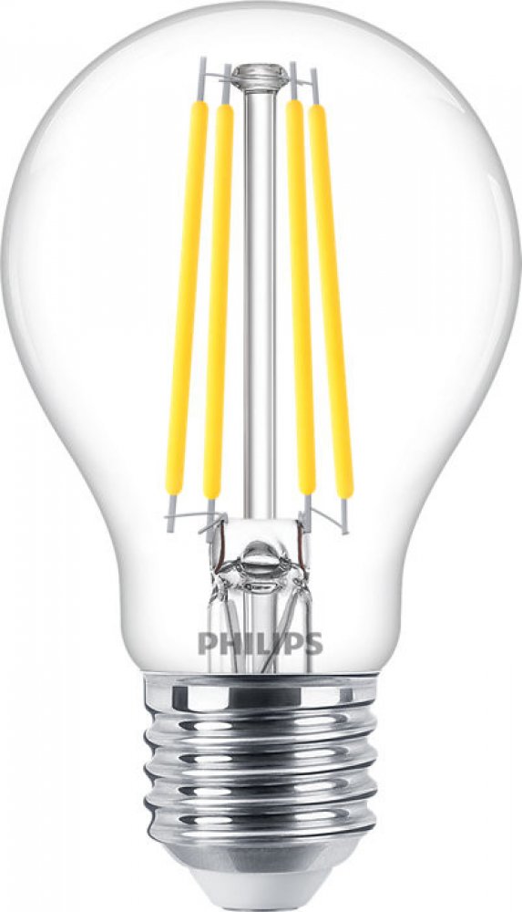 Stmívatelná LED žárovka Philips Master Value LEDbulb v retro vzhledu s paticí E27 a tradičním tvarem čiré skleněné baňky CL A60 má příkon 5,9 W a viditelná rovná vintage vlákna. Nahrazuje obyčejnou 60 W žárovku. Vydává teplé bílé světlo 2700 K.
