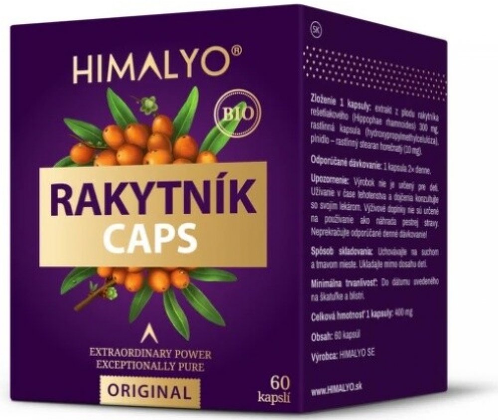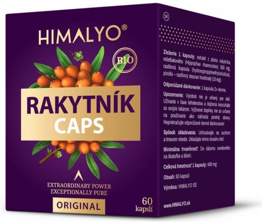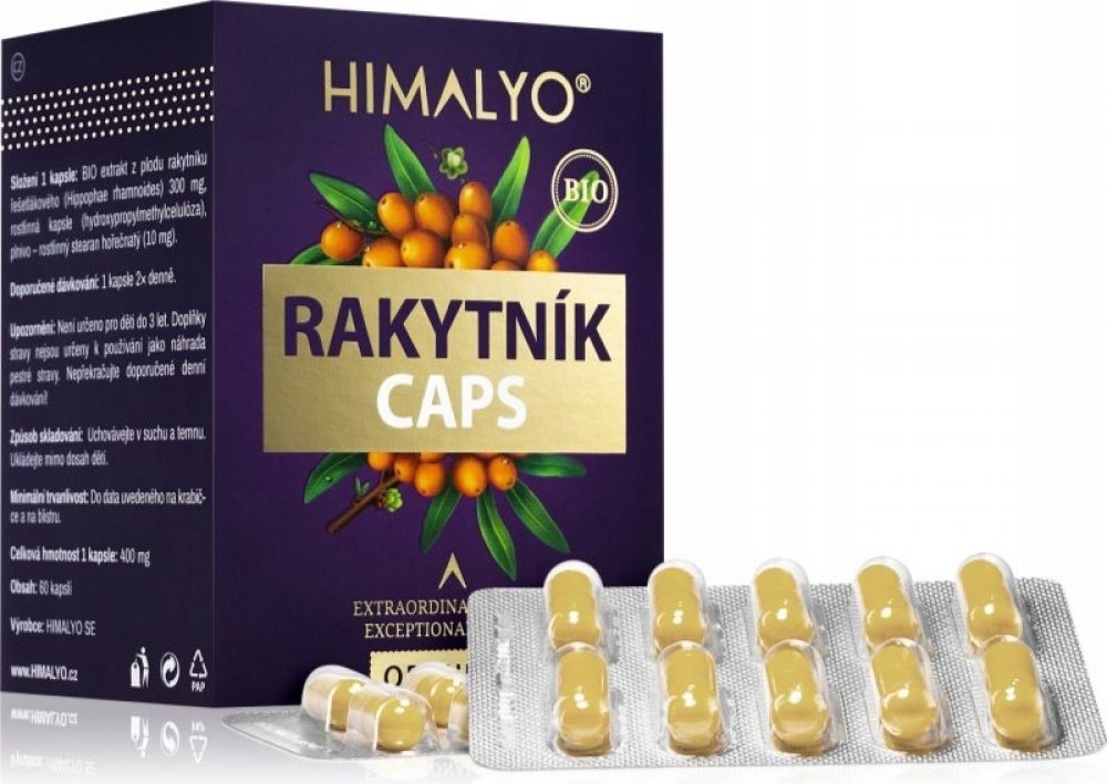 Složení: BIO extrakt z plodu rakytníku řešetlákového 300mg, rostlinná kapsle (hydroxypropylmethylcelulóza), plnivo – rostlinný stearan hořečnatý (10 mg).