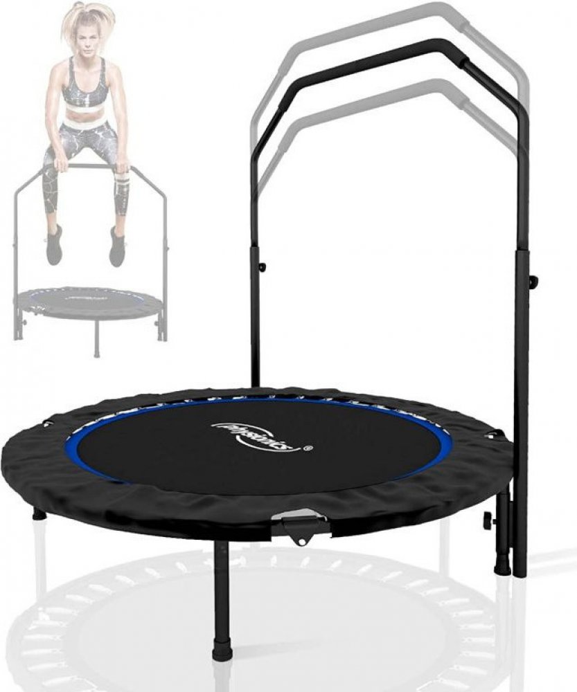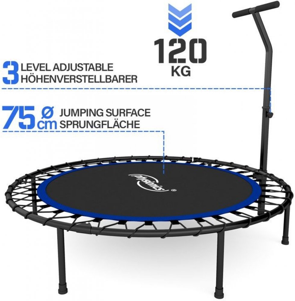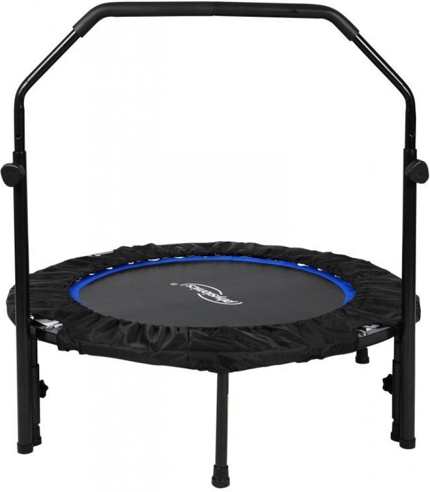 Fitness trampolína procvičuje břišní, hýžďové a zádově svaly. Zlepšuje rovnováhu, koordinaci a zároveň stimuluje lymfatický systém. Díky výškově nastavitelné rukojeti s pěnovým povrchem je tato trampolína ideální pro dospělé i děti. Naše mini trampolína má skákací plochu o průměru 75 cm, přičemž celkový průměr je 101 cm a může na něm cvičit osoba o maximální hmotnosti 120 kg. Tato trampolína je vybaveny gumovými lany namísto klasických železných pružin, což minimalizuje riziko zranění během tréninku. Nohy trampolíny jsou opatřeny protiskluzovými koncovkami, pro bezpečné cvičení doma.Tato fitness trampolína je neuvěřitelně kompaktní a velice snadno se přepravuje, sestavuje a skládá, takže můžete civičit na jakémkoli Vašem oblíbeném místě. Technické údaje:průměr trampolíny: cca 101 cmprůměr skákací plochy: cca 75 cmvýška nastavitelné rukojeti: cca 105-125 cm (3 stupně)skákací plocha po opěrku rkou: cca 81 - 101 cmvýška trampolíny: cca 24 cmhmotnost: cca 7,85 kgmaximální zatížení: 120 kgmateriál: trubkový ocelový rám, ocelová opěrka rukou (potažená pěnovými rukojeťmi), polypropylenová skákací plocha, gumové lanka, gumové koncovky nohoubarevná kombinace: modrá-černáObsah balení:1 x fitness trampolína