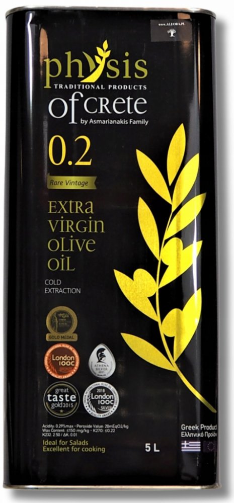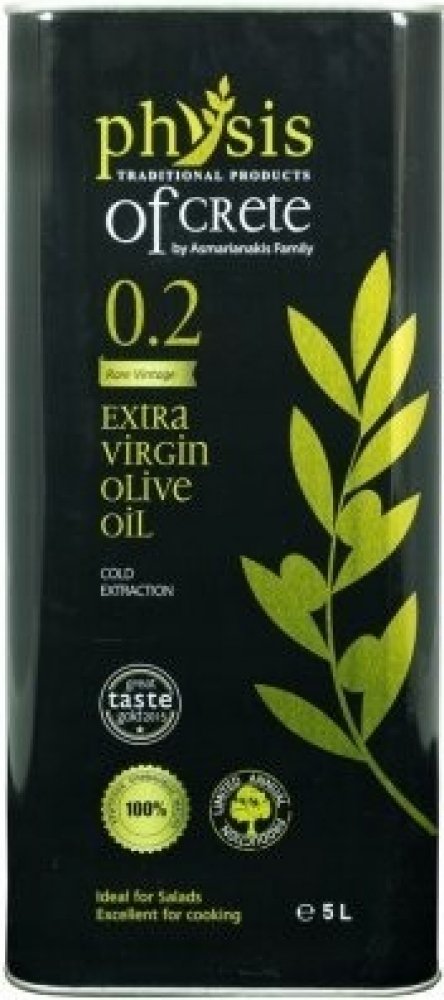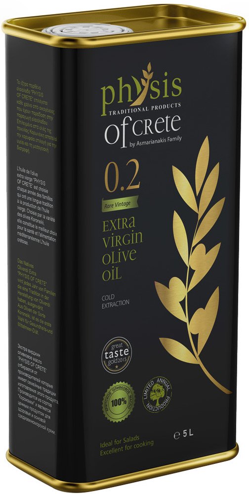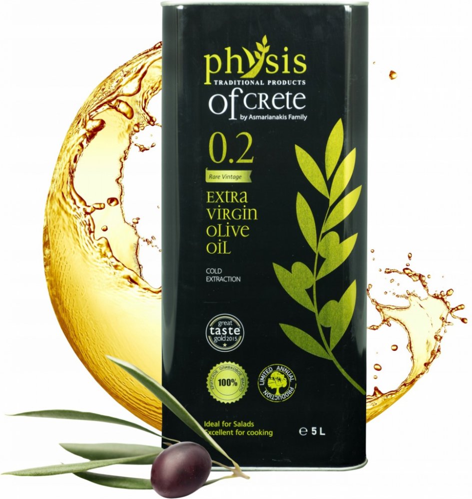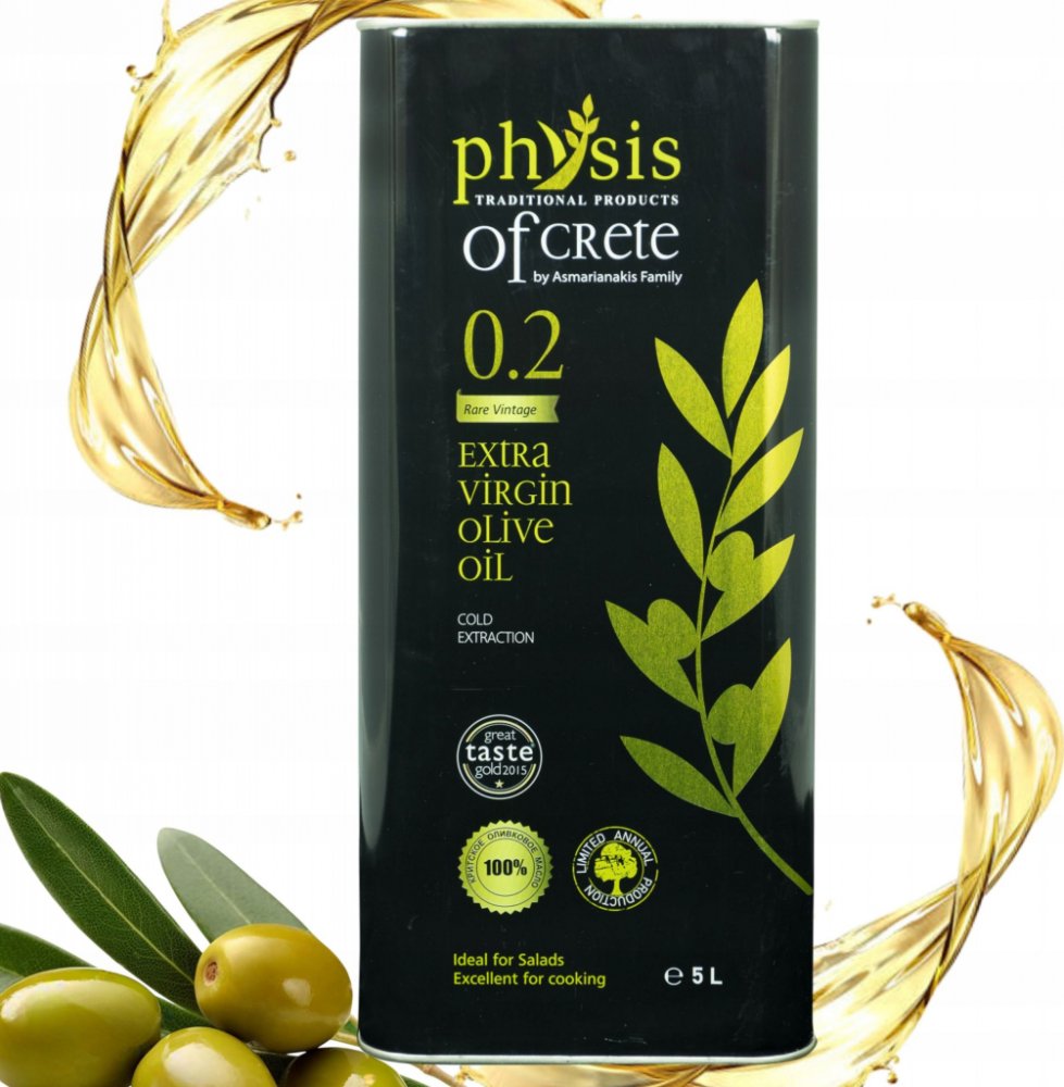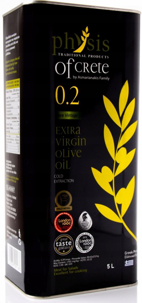 Extra panenský olivový olej „Physis of Crete 0.2“ s velmi nízkou kyselostí a ovocnou vůní! Vyrobeno na nejznámějším a nejmilovanějším ostrově v Krétě. Olej se vyznačuje intenzivní vůní a skvělými parametry, díky nimž je považován za jeden z nejlepších olejů dostupných na trhu.