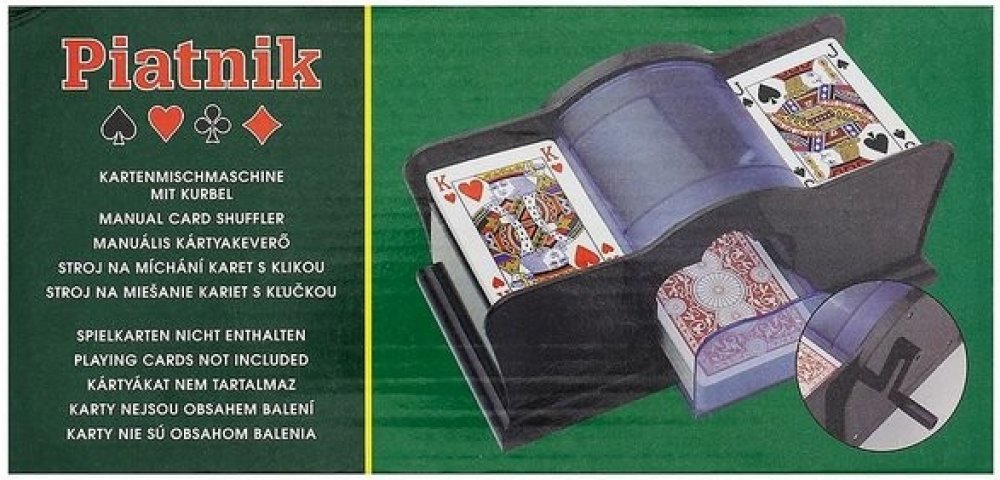Pokud holdujete karetním hrám, pak jistě oceníte tuto míchačku karet, s kterou karty zamícháte rychle a kvalitně. Ušetřete čas, námahu a vyvarujte se nařčení ze špatného zamíchání s touto mechanickou míchačkou. Užijte si spoustu zábavy s produkty Piatnik!