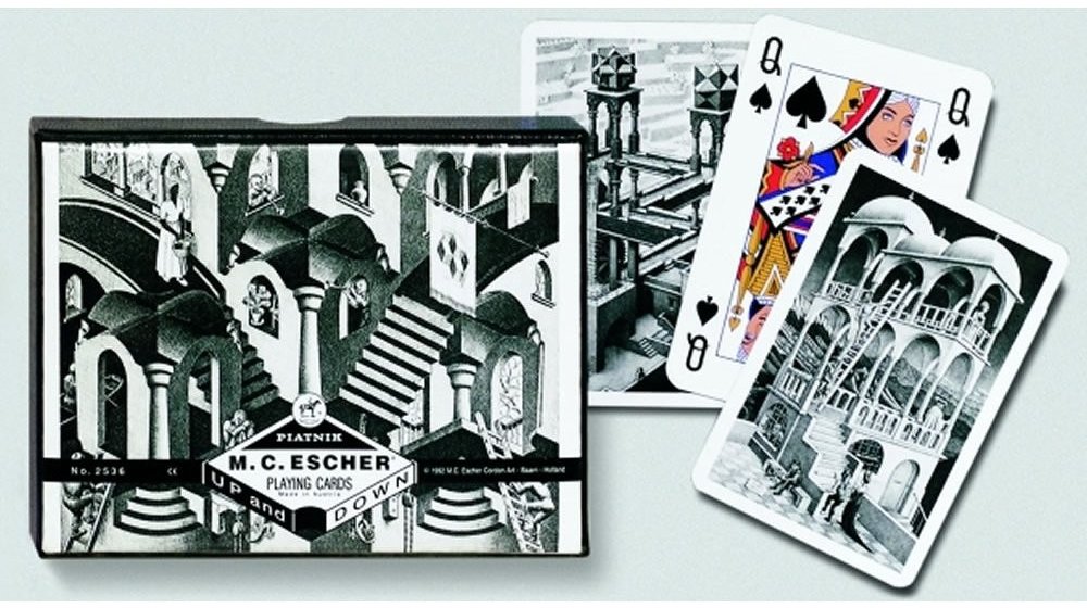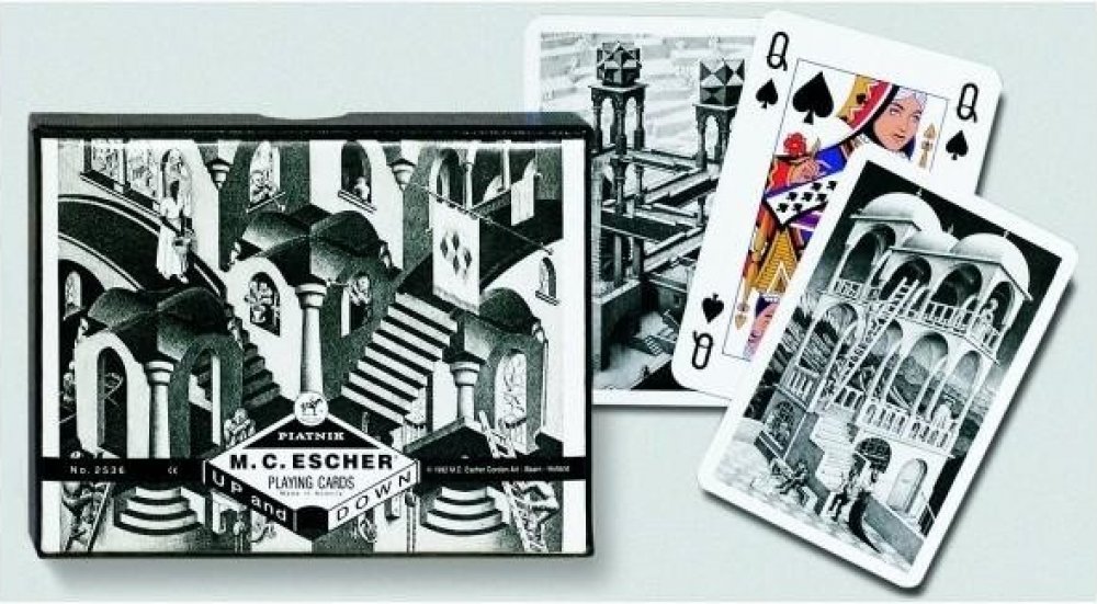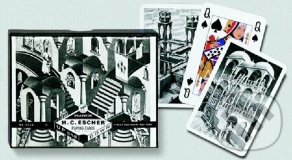 Luxusní hrací karty s motivy známého nizozemského umělce Eschera, ve kterých zobrazuje paradoxy perspektivního kreslení, topologické útvary a rozvržení roviny na pravidelné obrazce. Luxusní hrací karty s motivy známého nizozemského umělce Eschera, ve kterých zobrazuje paradoxy perspektivního kreslení, topologické útvary a rozvržení roviny na pravidelné obrazce.