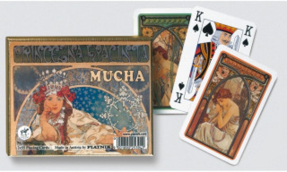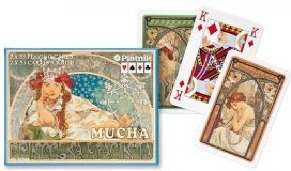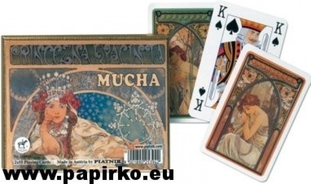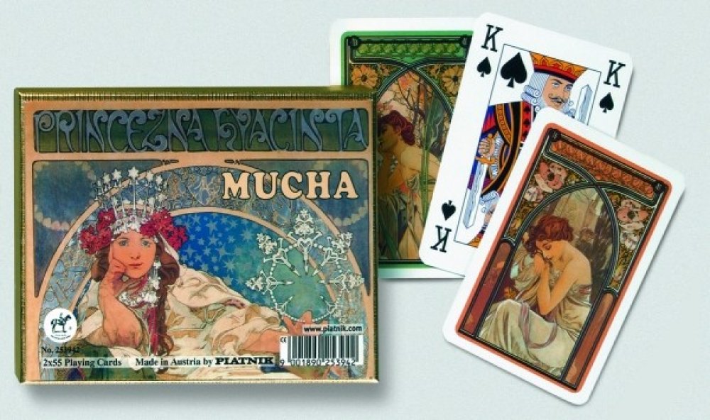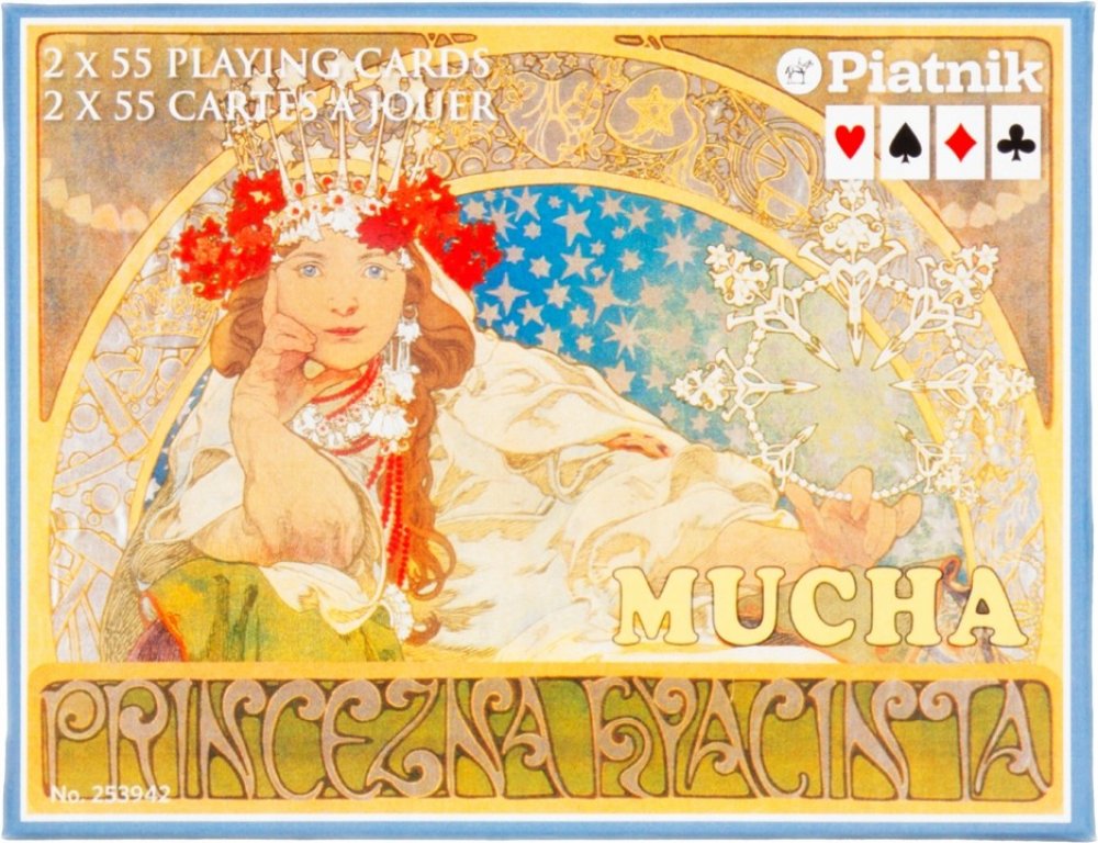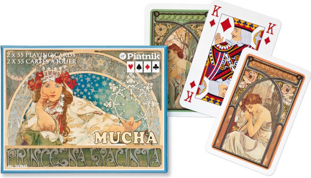 Kanasta je karetní hra, která se dostala do obliby ve druhé polovině 20. století a svoji popularitu si stále drží. Tyto kanastové karty jsou elegantně zdobeny obrazy s princeznou Hyacintou od umělce Alfonse Muchy. Luxusní karty na kanastu lze samozřejmě využít i pro hraní jiných her jako například žolíky či bridž. Balení Piatnik Kanasta Mucha Hyacinta obsahuje 2 x 55 karet/listů.