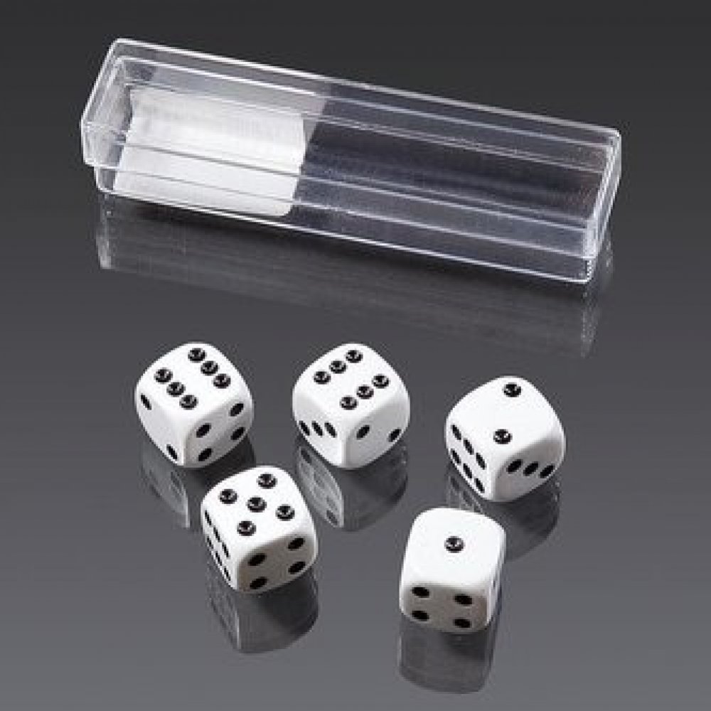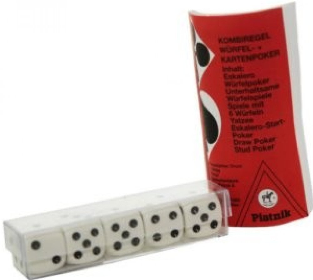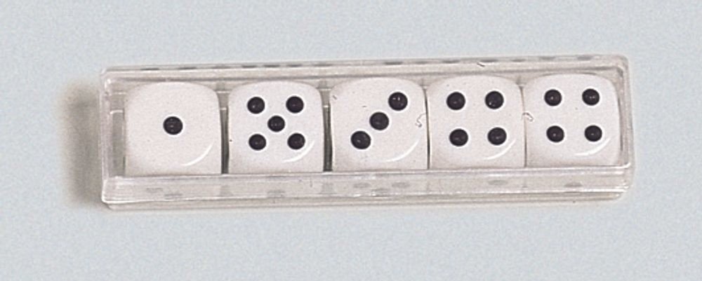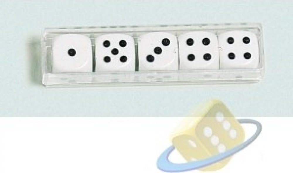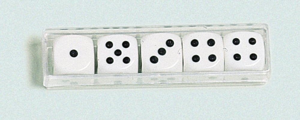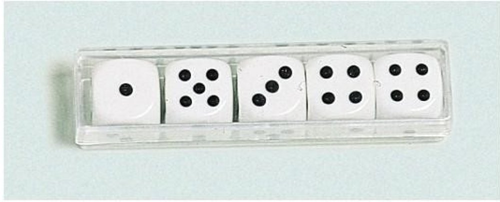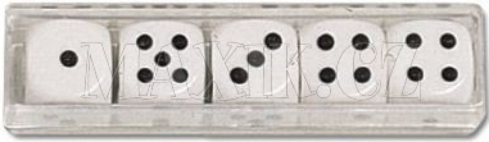 Podrobnosti o produktu EUR0392900 Sada 5 kusů klasických bílých kostek s černým zobrazením počtu na každé straně. K těmto kostkám je příhodný hrací kožený kelímek, nabízený jako další samostatný produkt.
