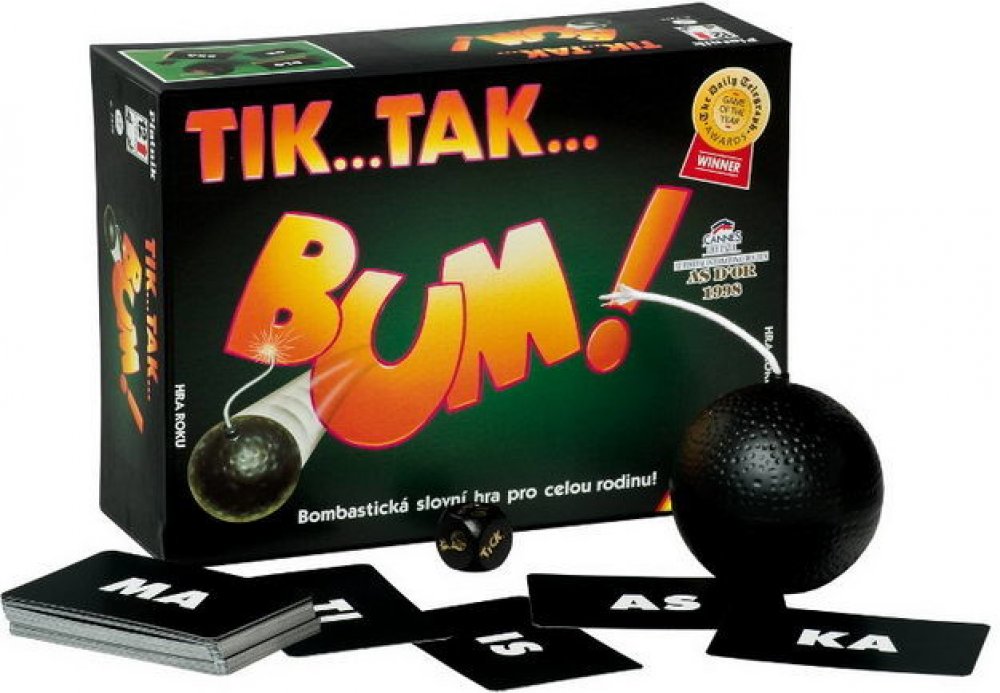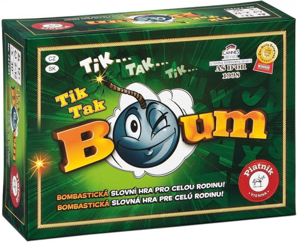 Skvělá hra rozvíjející slovní fantazii. Nikdo nechce, aby mu v ruce vybuchla časovaná bomba... Jedinou možností, jak její výbuch odvrátit, je vymyslet co nejrychleji slovo na zadanou slabiku a tikající bombu přehodit dalšímu hráči.Hra obsahuje: 55 hracích karet se 110 slabikamispeciánlí hrací kostku se třemi znakybombu na baterie (2xAAA 1,5V baterie - nsjou součástí balení)pravidlaHra pro 2 - 12 hráčů, kteří mají rádi napětí spojené se zábavou. Britský "The Daily Telegraph" ocenil tuto hru jako nejúspěšnější hru roku. Hra má iu nás skvělé recenze od hráčů, kteří oceňují dynamiku hry, zábavu i nutnost namáhat své mozkové závity!