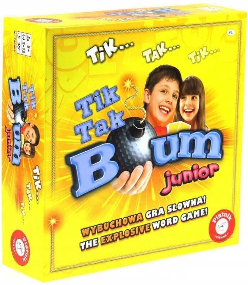Kultovní, mnohokrát oceněná slovní hra Tik Tak Bum nyní ve verzi pro mladší hráče (od 5 let pro 2-12 hráčů). Rychlá, zábavná a vzdělávací. Skvěle procvičuje kreativitu, spontánnost a slovní zásobu. Průběh hry: Hráč, který drží tikající „bombu“, musí rychle vyslovit slovo spojené s kresbou na kartě a předat ho dalšímu hráči. Pokud je na kartě například pláž, možná slova jsou „písek“, „lehátko“, „dovolená“, „kyblík“ apod. Nikdo neví, jak dlouho bude „bomba“ tikat: 10, 20, 30 sekund nebo možná celou minutu? V Tik Tak Bum Junior může hrát libovolný počet dětí (i dospělých) – čím více, tím je to jasnější! Karty jsou podepsány v polštině a angličtině, takže hra může sloužit jako pomůcka pro výuku angličtiny. Obsah: 110 karet s zábavnými obrázky zobrazujícími různá místa a situace, 1 elektronická „bomba“ s časovým mechanismem (hra vyžaduje 2 baterie AAA 1,5 V „malé prstíky“, nejsou součástí balení), 1 návod