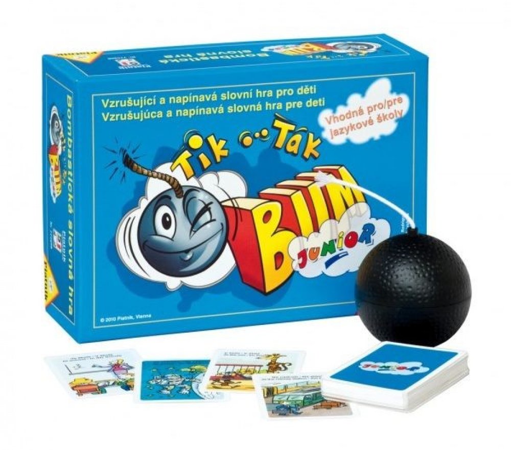 Rychlá slovní hra Tik Tak Bum Junior podporuje kreativitu, spontánnost a slovní zásobu! Bomba se nastartuje. Nikdo neví, jak dlouho bude tikat. Odkryje se první karta. Kdo má v ruce bombu, musí říci nějaké slovo, které má spojitost s obrázkem na kartě.
