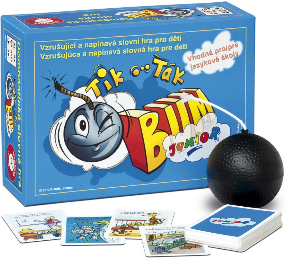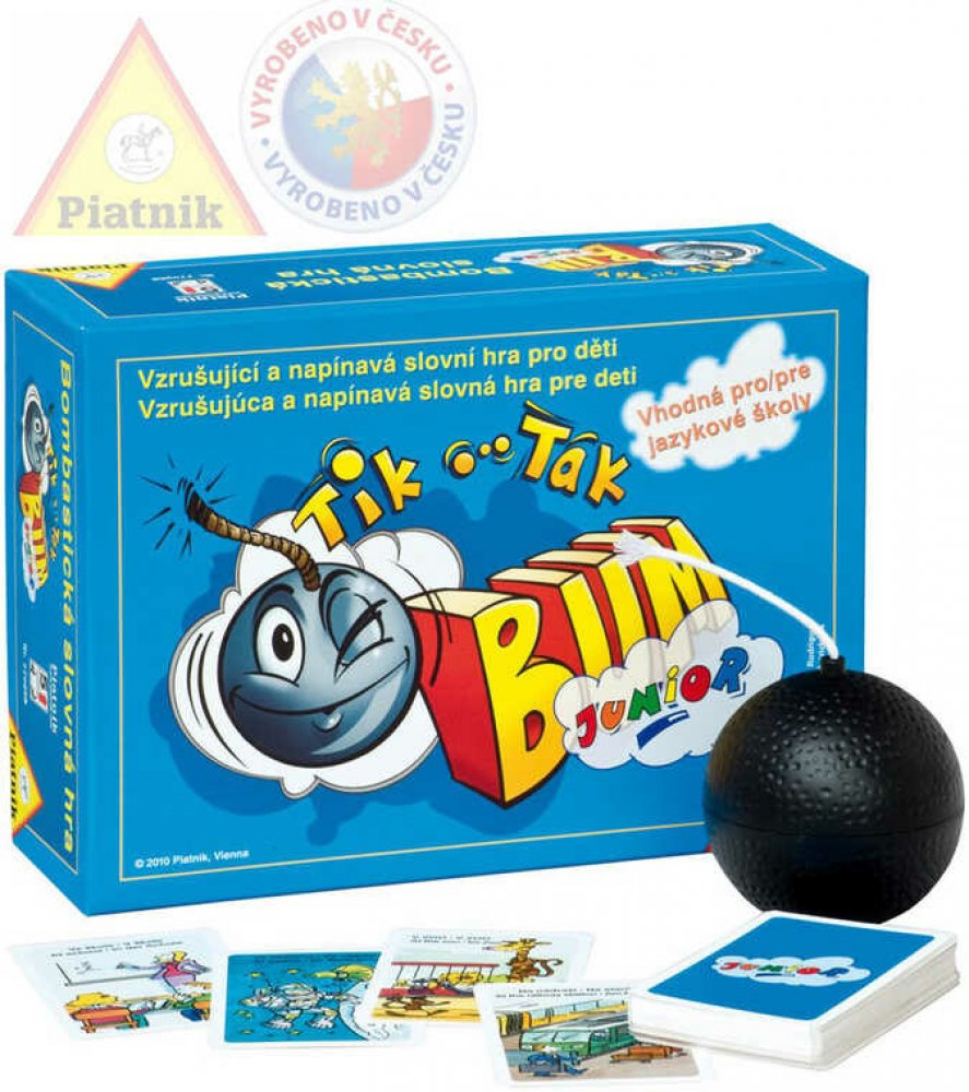 Rychlá slovní hra Tik Tak Bum Junior podporuje kreativitu, spontánnost a slovní zásobu! Zapni bombu, odkryj kartu, řekni slovo, které souvisí s obrázkem na kartě a předej rychle tikající bombu dalšímu hráči. Karty jsou nadepsány v pěti jazycích – českém, slovenském, anglickém, francouzském a německém. Hra je vhodná i pro jazykové školy.