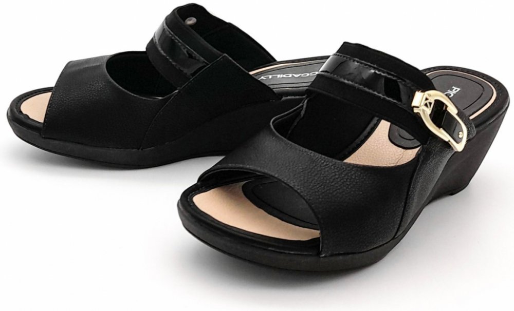 Dámské pantofle na klínku, vyrobené z kvalitní syntetiky, zdobené lakovými prvky a zlatou sponou na elastickém pásku v nártové části. Stélka je příjemně vyměkčená.
