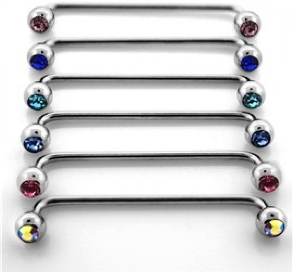 Industrial piercing PIN00049 ozdobený barevnými kamínky. Piercing je vyrobený z chirurgické oceli 316l.