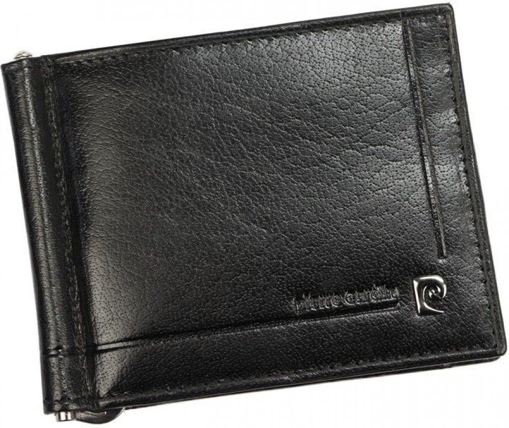 Černá kožená dolarovka Pierre Cardin. Uvnitř je 6 slotů na karty, 2 zastrkávací přihrádky na doklady a uprostřed spona na bankovky. .
