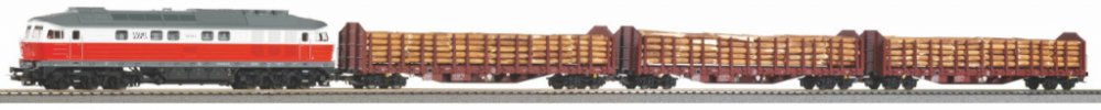 Ukázka zvuku zabudovaného digitálního dekodéru. Exkluzivní souprava diesel‑elektrického nákladního vlaku „Dřevo z jižního Durynska“ soukromého dopravce WFL, vydaná při příležitosti dne otevřených dveří sonnebergské továrny výrobce PIKO. Vlak pohání precizně zpracovaná lokomotiva BR 232 „Ludmilla“, která díky svým šesti nápravám, dlouhému litému zinkovému rámu o vysoké hmotnosti a výkonnému, setrvačníky opatřenému motoru nabízí mimořádné jízdní vlastnosti. Model ovšem vyniká i řadou věrně, do nejmenších podrobností ztvárněných vnějších detailů, jako jsou okénka strojovny, výdechy ventilace, schůdky a zábradlí dveří. Jeho bílé/červené směrové LED osvětlení se mění v závislosti na směru jízdy a osvětlena je i kabina strojvedoucího. Výbavu modelu korunuje digitální dekodér se zvukovým modulem a velkým reproduktorem, který obsahuje knihovnu zvuků věrných předloze a umožňuje pokročilé ovládání světel i osvětlení kabiny. Je kompatibilní s protokoly DCC, Rail‑ComPlus®, Motorola® a Selectrix®, a umožňuje i provoz v analogovém režimu. Příslušný provozní režim umí sám chytře rozeznat. S ovládacími jednotkami PIKO SmartControl, nebo i jednotkami kompatibilními s formátem mfx®, nabízí široké možnosti individuálního mapování. K lokomotivě je pak připojena trojice dlouhých plošinových vozů Roos‑t642 s odnímatelnými klanicemi a pečlivě zpracovaným nákladem dřeva. Vagóny jsou citlivě ztvárněny a autenticky zachycují i nejmenší podrobnosti každodenního provozu. Hlavní vlastnosti:vestavěn digitální dekodér se zvukovým modulem a reproduktoremšestice nápravmotor s dvojicí setrvačníkůdvojice bandážovaných hnacích kolsvětla s přepínáním barvy dle směru jízdyosvětlení interiérurozhraní PluX22 dle NEM 658šachta dle NEM 362 s kinematikou krátkého spřáhla Tato sada obsahuje:dieselová lokomotiva BR 232 „Ludmilla“ WFL VI (1 ks) plošinový vagón s klanicemi a nákladem dřeva Roos‑t642 WFL VI (3 ks) Dokumentace: brožura k modelům lokomotiv BR 132/BR 232 (DE) návod k obsluze a seznam náhradních dílů modelu lokomotivy BR 232 „Ludmilla“ (DE, EN, FR, NL)