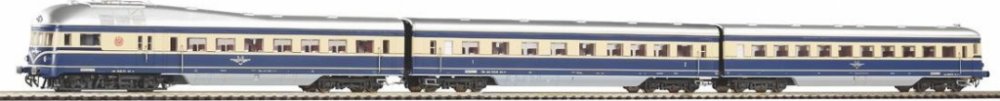 Piko Dieselový vlak Rh 5045 BBÖ Blauer Blitz III - 52070 Model dieselového vlaku Rh 5045 „Modrý Blesk“ železniční společnosti ÖBB, éra III. Skládá se z jednoho řídícího a dvou osobních vozů, na všech jsou loga ÖBB. Rozhraní PluX22. Směrová světla bílá/červená, 2 trakční pneumatiky. Obsahuje přípojku pro PI52070. Německá firma PIKO se zabývá výrobou modelů lokomotiv, vagónu, start setů, kolejiva a kolejových setů. Klasickým výrobkem, kterým se firma PIKO celosvětově proslavila, je modelová železnice. Modely železnice jsou vysoce detailní. Firma PIKO vyrábí modely ve velikostech H0 (měřítko 1:87), G (měřítko 1:25), TT (měřítko 1:120) a N (měřítko 1:160). PIKO modelové železniční výrobky pokrývají nejrůznější potřeby modelářů. Jsou pravidelně testovány a oceňovány v domácím i zahraničním tisku.