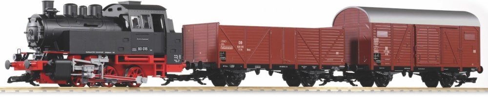 Startovací sada soupravy nákladního vlaku skládající se z parní lokomotivy BR 80 a dvou nákladních vozů, krytého a otevřeného, v provedení DB. Lokomotiva má chromovaná dvojkolí a je vybavena kuličkovými ložisky. Disponuje osvětlením měnícím se v závislosti na směru jízdy, analogově ovládaným zvukem a spínatelným výrobníkem kouře. Zvuk je ovládán dvojicí traťových spínacích magnetů, které jsou souč...
