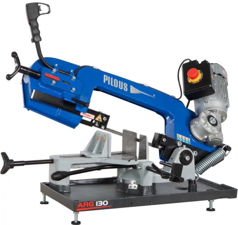 Manuální pásová pila PILOUS ARG 130 s maximální řeznou kapacitou Ø130mm (kulatina), 180x100mm (profil). 1 řezná rychlost 75m/min. Možnost nastavení úhlových řezů 0° do +60°. Příkon 0,55 KW.