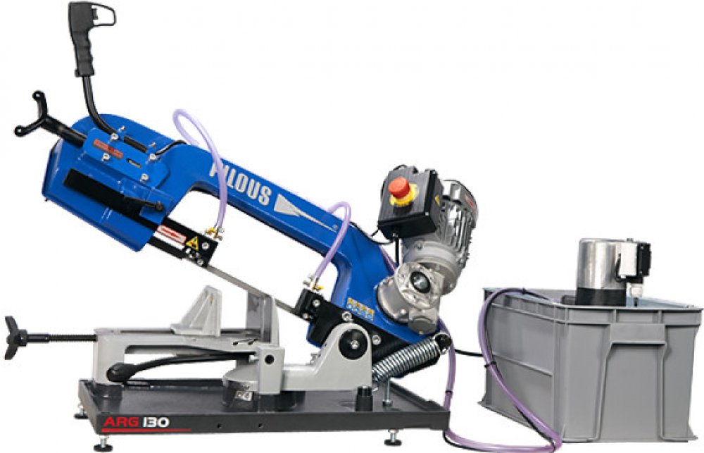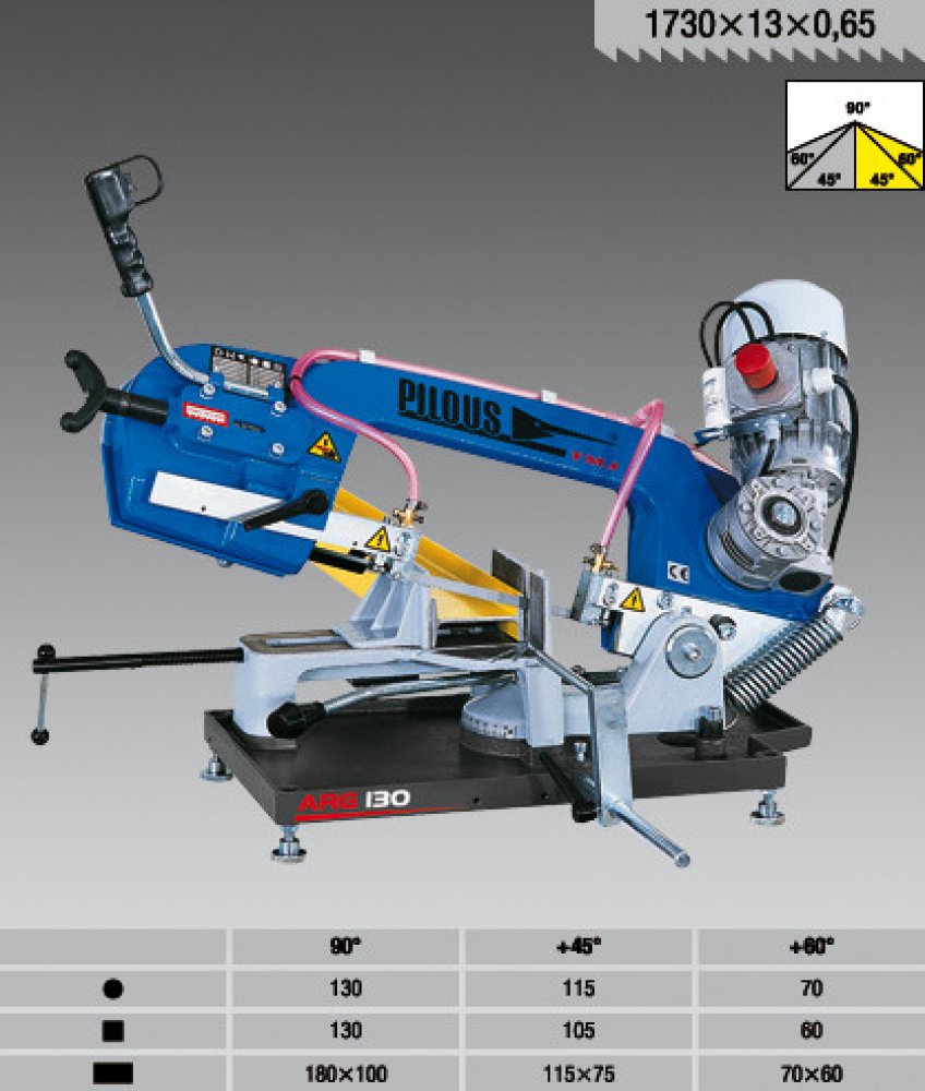 Pásová pila na kov Pilous ARG 130 mobil Hlavní motor 230 V, 50 Hz, 0,55 kW Rychlost pásu 75 m/min. Rozměry stroje (min.) 980 x 420 x 550 m Rozměry stroje (maxx.) 1030 x 840 x 810 mm Hmotnost 50 kg 90° plus 45° plus 60° 130 115 70 130 105 60 180 x 100 115 x 75 70 x 60 Odlehčená verze ARG 130 určená pro práci na stavbách a montážích. Pro dosažení co nejnižší váhy jsou rameno pilového pásu, vana a ot...