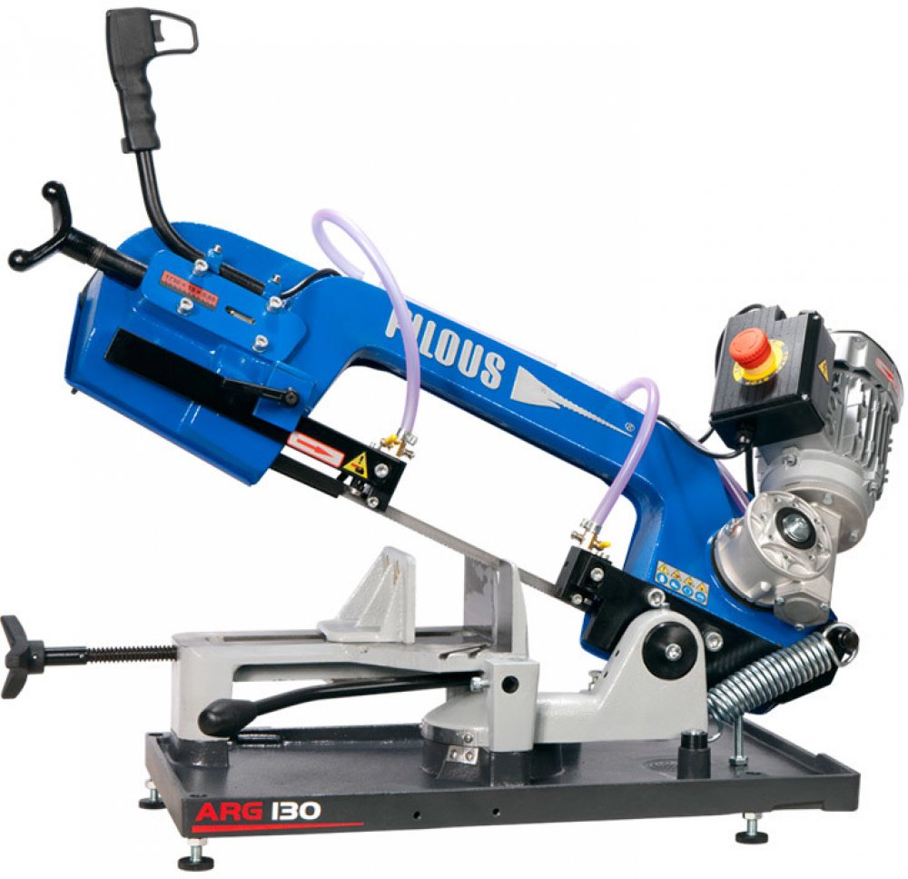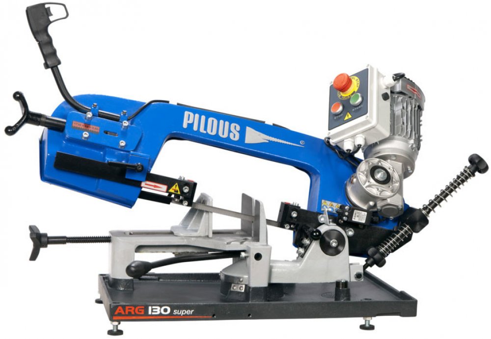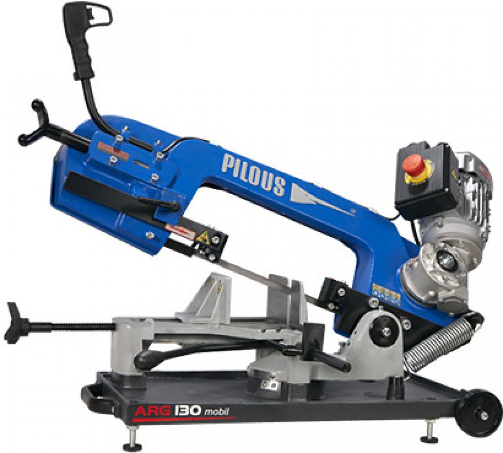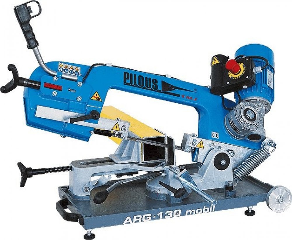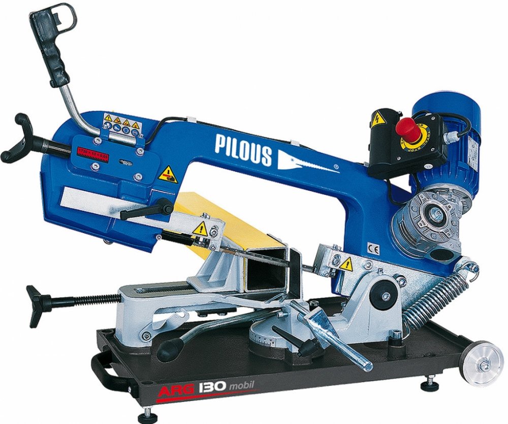 Pásová pila na kov Pilous ARG 130 mobil Hlavní motor 230 V, 50 Hz, 0,55 kW Rychlost pásu 75 m/min. Rozměry stroje (min.) 980 x 420 x 550 m Rozměry stroje (maxx.) 1030 x 840 x 810 mm Hmotnost 50 kg 90° plus 45° plus 60° 130 115 70 130 105 60 180 x 100 115 x 75 70 x 60 Odlehčená verze ARG 130 určená pro práci na stavbách a montážích. Pro dosažení co nejnižší váhy jsou rameno pilového pásu, vana a otočný stůl stroje vyrobeny z hliníkových odlitků. Namáhaný svěrák a oběžná kola pilového pásu jsou z důvodu dosažení maximální životnosti z šedé litiny. Pro snadný transport je stroj vybaven aretací ramene ve spodní poloze, pojezdovými kolečky a madlem. Posuv pilového pásu do řezu, zvedání ramene a upínání materiálu se provádí ručně. Moderní koncepce ramene pilového pásu umožňuje velké řezné rozsahy při kolmých řezech i při dělení pod úhlem. Plynulé nastavení úhlu řezu v rozsahu 90°–60° při stálé poloze upnutého materiálu. Jednoduchá aretace a nastavení požadovaného úhlu řezu na úhlové stupnici. V této kategorii pásových pil maximální přesnost řezu a životnost pilového pásu. Precizní třístranné tvrdokovové vedení pilového pásu. Průmyslové uložení oběžných kol a systému napínacího kola a všech rotačních částí jako u velkých profesionálních strojů. Profesionální, tichý a bezúdržbový pohon pilového pásu je zajištěn průmyslovým elektromotorem se šnekovou převodovkou. Jednofázový, jednorychlostní motor 230 V. Stroj je vybaven nastavitelným dorazem materiálu o délce 250 mm. Skládací podstavec U 130 Umožňuje instalaci stroje v ergonomické výšce. Pojezdová kolečka usnadňují transport stroje na podstavci v jeho složené i rozložené poloze.