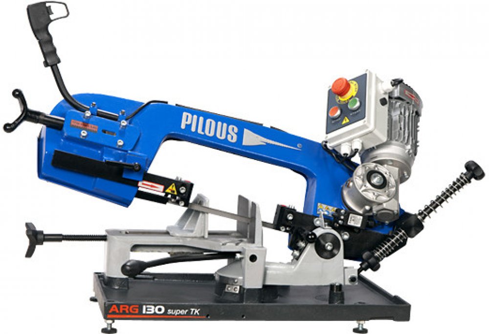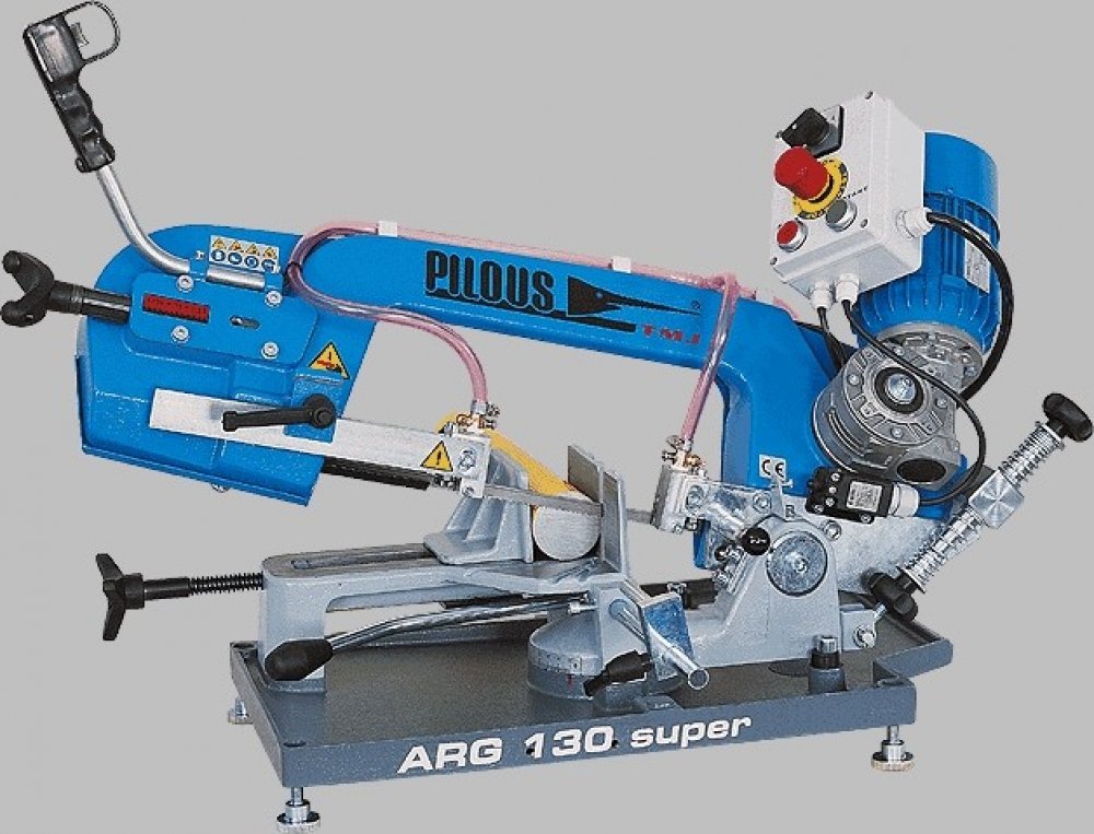 Pásová pila na kov Pilous ARG 130 super Hlavní motor 230 V, 50 Hz, 0,55 kW / 400 V, 50 Hz, 0,37/0,55 kW Motor čerpadla 230 V, 50 Hz, 0,065 kW / 400 V, 50 Hz, 0,05 kW Rychlost pásu 75 m/min. / 40/80 m/min. Pracovní výška svěráku (s podstavcem) 900 mm Nádrž chladící kapaliny cca 15 l Rozměry stroje (min.) 980 x 420 x 550 mm Rozměry stroje (max.) 1030 x 840 x 1540 mm Hmotnost stroje 70 / 77 / 100 kg 90° plus 45° plus 60° 130 115 70 130 105 60 180 x 100 115 x 75 70 x 60 Univerzální „malá“ pásová pila nachází všeobecné uplatnění v zámečnických a údržbářských dílnách, strojních provozech i při montážích v terénu. Robustní konstrukce stroje je tvořena odlitky z šedé litiny. Na rozdíl od základní verze ARG 130 je posuv do řezu prováděn vlastní vahou ramene s možností regulace přítlaku pomocí speciálního sytému pružin. Po skončení řezu se pohon pilového pásu automaticky vypne. Pro rychlé dělení malých průřezů je možné nastavit systém pružin i pro ruční přítlak do řezu. Mechanická aretace horní polohy ramene pilového pásu. Rameno pilového pásu se zvedá ručně. Moderní koncepce ramene pilového pásu umožňuje velké řezné rozsahy při kolmých řezech i při dělení pod úhlem. Plynulé nastavení úhlu řezu v rozsahu 90°–60° při stálé poloze upnutého materiálu. Jednoduchá aretace a nastavení požadovaného úhlu řezu na úhlové stupnici. V této kategorii pásových pil maximální přesnost řezu a životnost pilového pásu. Precizní třístranné tvrdokovové vedení pilového pásu. Průmyslové uložení oběžných kol a systému napínacího kola a všech rotačních částí jako u velkých profesionálních strojů. Profesionální, tichý a bezúdržbový pohon pilového pásu je zajištěn průmyslovým elektromotorem se šnekovou převodovkou. Stroj může být vybaven dvěma druhy motorů. Jednofázový motor (230 V) s univerzální rychlostí pásu 75 m/min. umožňuje snadné připojení k síti. Třífázový dvojrychlostní motor (400 V) s rychlostí pásu 40 a 80 m/min. je vhodný při častějším děleni plných materiálů a silnostěnných profilů. Stroj je vybaven nastavitelným dorazem materiálu o délce 250 mm. Pásové pily ARG 130 super se vyrábí v těchto provedeních: ARG 130 super Stolní verze bez chlazení ARG 130 super TK Stolní verze s chlazením. Ke stroji je zapojen kompletní chladící systém s profesionálním výkonným čerpadlem a možností samostatné regulace průtoku na obou vodících kostkách. ARG 130 super K Verze s podstavcem a chlazením. Ke stroji je zapojen kompletní chladící systém s profesionálním výkonným čerpadlem a možností samostatné regulace průtoku na obou vodících kostkách. Vana emulze chladicího systému je umístěna v podstavci stroje. Tato verze umožňuje instalaci válečkových dopravníků před i za řezem.