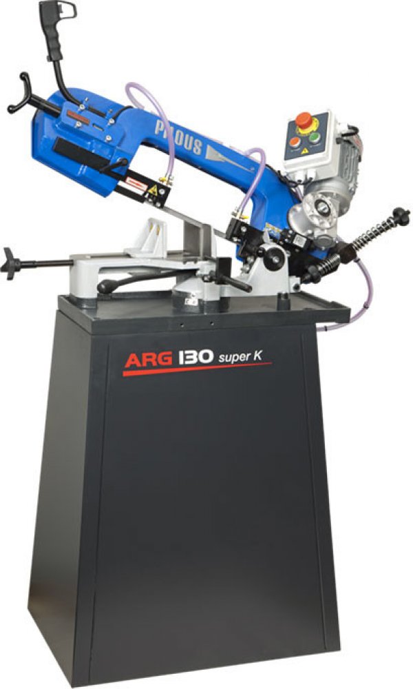 Manuální gravitační pásová pila PILOUS ARG 130 super K s maximální řeznou kapacitou Ø130mm (kulatina), 180x100mm (profil). 2 řezné rychlosti 40 a 80m/min. Možnost nastavení úhlových řezů 0° do +60°. Příkon 0,55 KW.