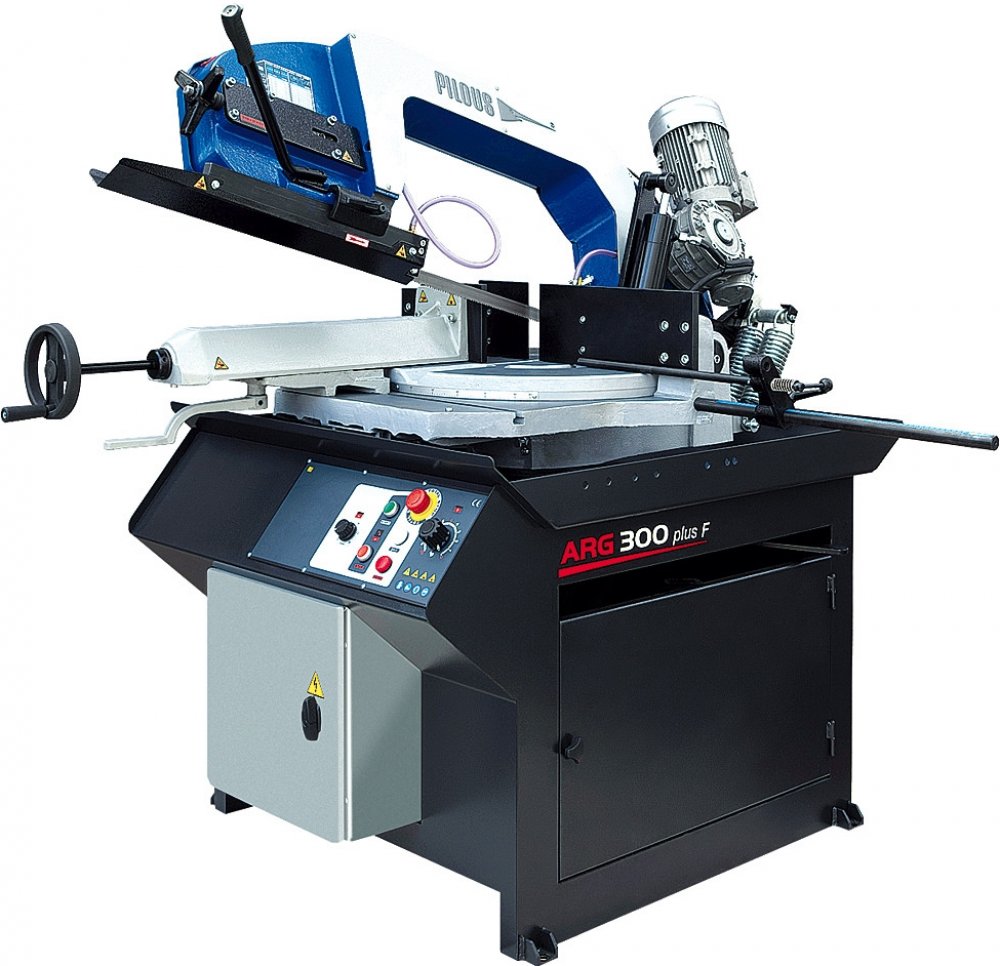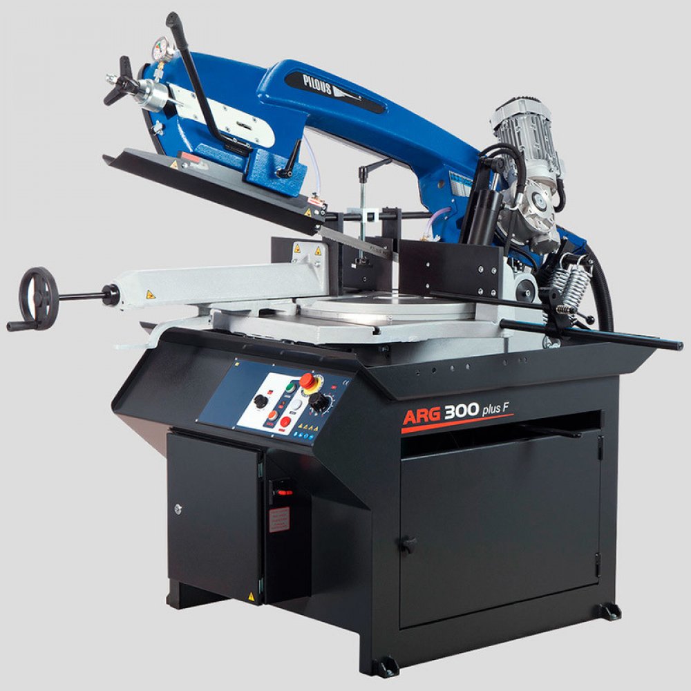 Pásová pila na kov Pilous ARG 300 plus F Hlavní motor 400 V, 50 Hz, 2,2 kW Motor čerpadla 400 V, 50 Hz, 0,05 kW Rychlost pásu 15 – 90 m/min. Pracovní výška svěráku 910 mm Nádrž chladící kapaliny cca 15 l Rozměry stroje (min.) 1740 x 950 x 1560 mm Rozměry stroje (max.) 2180 x 1870 x 2050 mm Hmotnost stroje 625 kg 90° -45° plus 45° plus 60° 300 220 240 155 290 195 225 150 375 x 190 240 x 100 240 x 160 150 x 150 Nový unikátní design. Inovovaná verze legendární, již 20 let vyráběné modelové řady ARG 300 se zcela novým ramenem pilového pásu. Nejmodernější koncepce odlitku ramene, který je po celé délce ve všech nosných částech dutý a tvoří uzavřený profil. To zaručuje mimořádnou tuhost celého systému a maximálně přesný řez a životnost pilových pásů. V dutých částech ramene jsou ukryty všechny rozvody elektroinstalace a chladící kapaliny a tím jsou chráněny proti poškození. Nový koncept ramene přináší také velké zjednodušení při výměně pilového pásu, nebo při čistění vnitřku ramene, kdy se zadní kryt ramene jednoduše vyklopí na pantech a zůstane zaaretovaný v horní poloze. Mimo zcela nového designu ramene došlo i k mnoha technickým úpravám a změnám zlepšujících kvalitu, uživatelský komfort a životnost stroje. Rameno pilového pásu se zvedá ručně, posuv do řezu je prováděn vlastní vahou ramene s možností jemné plynulé regulace škrtícím ventilem olejového tlumiče. Po dokončení řezu se pohon pilového pásu automaticky vypne. Pro snadné zvedání ramene je stroj vybaven nastavitelnými tažnými pružinami, umožňujícími nastavení optimální síly potřebné pro zvednutí ramene dle charakteru řezaného materiálu. K mnohostrannému využití přispívá i systém svěráku umožňující oboustranné plynulé nastavení úhlu řezu v rozsahu 60° vpravo a 45° vlevo. K dosažení maximální produktivity řezání nyní nově možnost nastavení optimální rychlosti pilového pásu pomocí frekvenčního měniče v rozsahu 15–90 m/min. To výrazně přispívá k rychlosti a přesnosti řezu a delší životnosti pilových pásů. Velký podstavec a masivní systém natáčení ramene s velkými ložnými plochami zaručují mimořádnou stabilitu stroje i při řezání těžkých obrobků. Robustní konstrukce stroje tvořená odlitky v šedé litině zaručuje pohlcování vibrací. Moderní koncepce ramene pilového pásu umožňuje velké řezné rozsahy při kolmých řezech i při dělení pod úhlem. Otočný stůl se otáčí zároveň s pilovým pásem. Nedochází tím k zařezávání pilového pásu do ložné plochy svěráku. Jednoduchá aretace a nastavení požadovaného úhlu řezu na úhlové stupnici s pevnými dorazy pro 60° vpravo a 45° vlevo. Masivní svěrák s funkcí rychloupínání zajišťuje snadné a spolehlivé upnutí materiálu. Velký průměr oběžných kol a precizní třístranné tvrdokovové vedení zaručují dlouhodobou životnost pilového pásu a přesnost řezu. Naddimenzované uložení oběžných kol, systému napínacího kola a všech rotačních částí zvyšují dlouhodobou životnost stroje. Tichý a bezúdržbový pohon pilového pásu je zajištěn průmyslovým elektromotorem se šnekovou převodovkou. Ke stroji je zapojen kompletní chladící systém s výkonným čerpadlem a možností samostatné regulace průtoku na obou vodících kostkách. Vana emulze s čerpadlem je umístěna v podstavci stroje. Snadné ovládání pomocí ergonomicky umístěných ovládacích prvků (elektro i hydraulika) na podstavci stroje. Stroj je vybaven nastavitelným odklopným dorazem materiálu s 500mm stupnicí. Odklopný systém brání vzpříčení řezaného materiálu.