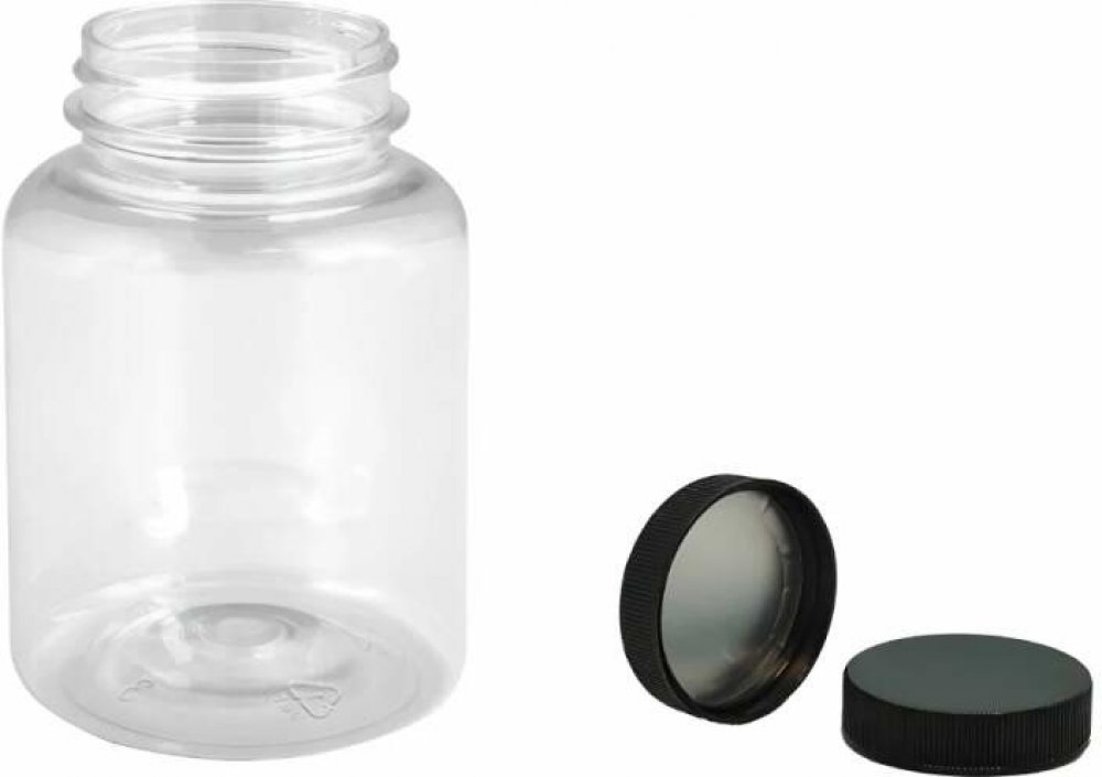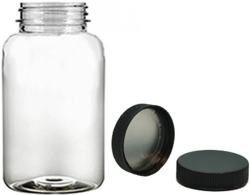 Pilulka Plastová lékovka čirá s černým uzávěrem s ALU vložkou 200 ml