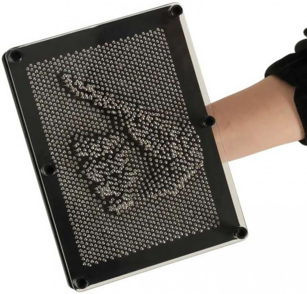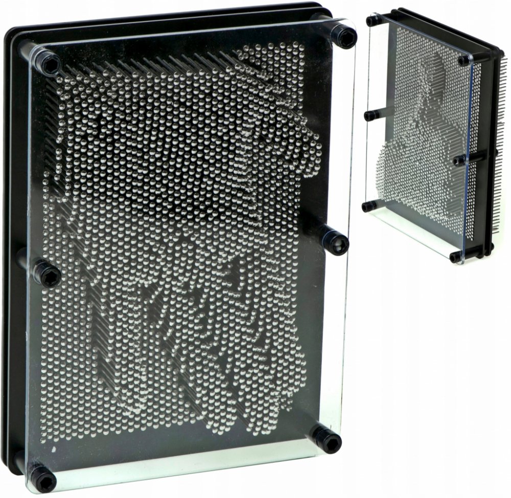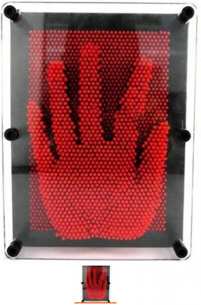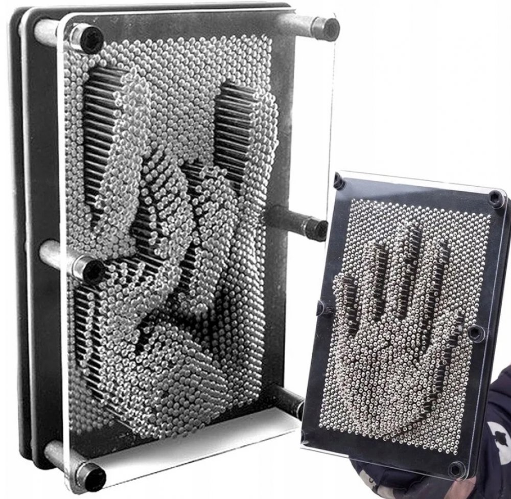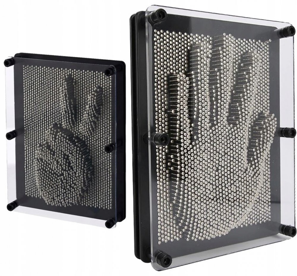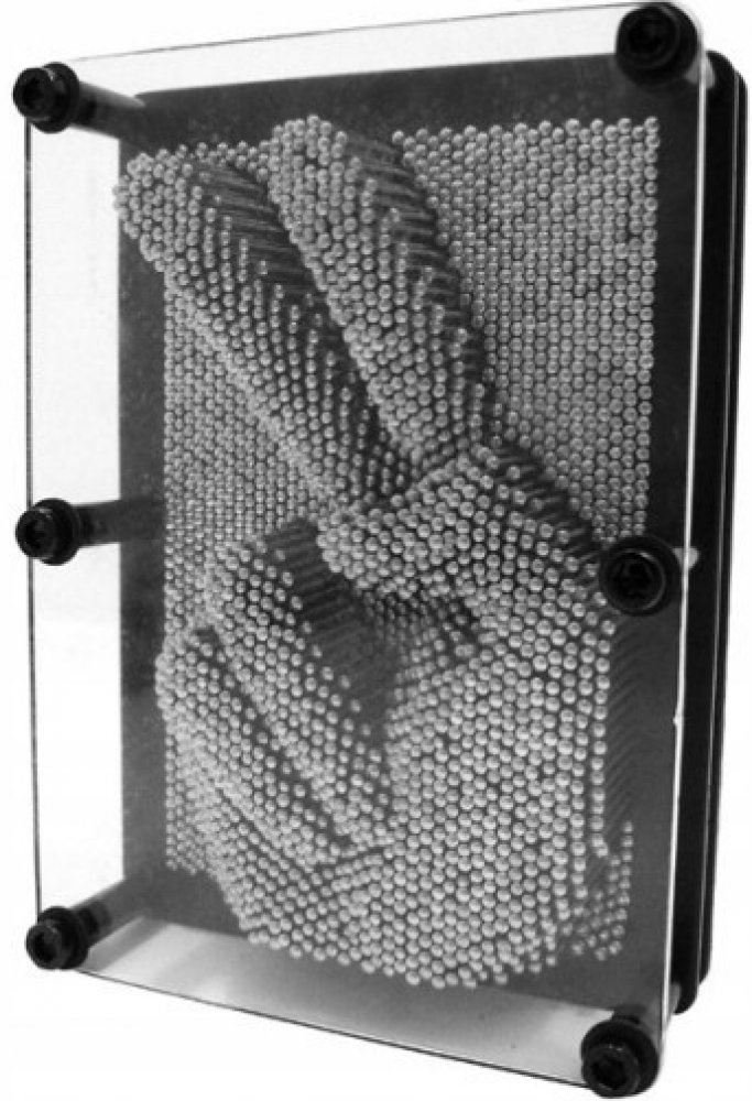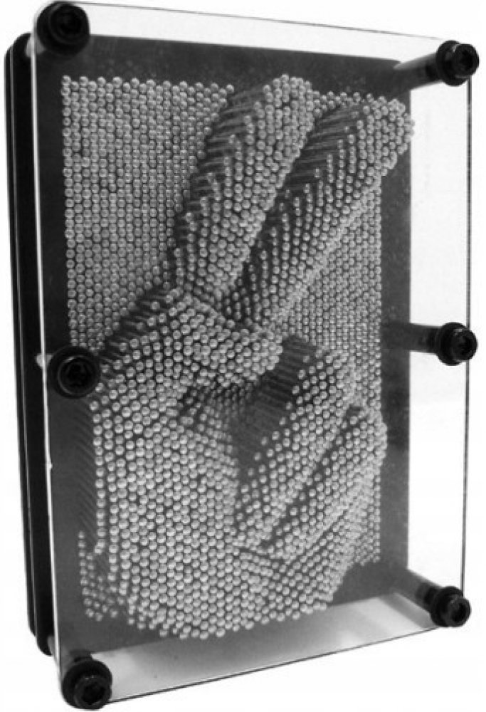 V rámečku je umístěno téměř 1000 plastových kolíků, které plasticky ztvárňují tvar přiložený k druhé straně rámečku a zachovávají si tento trojrozměrný obraz, dokud nenakloníme celek.