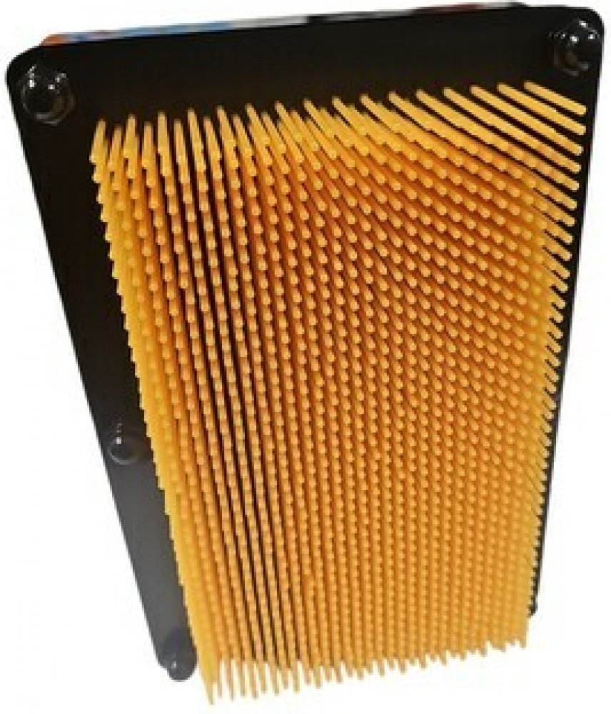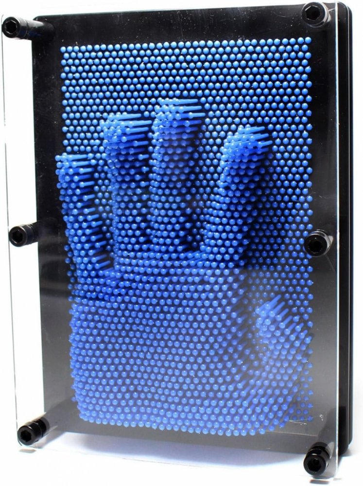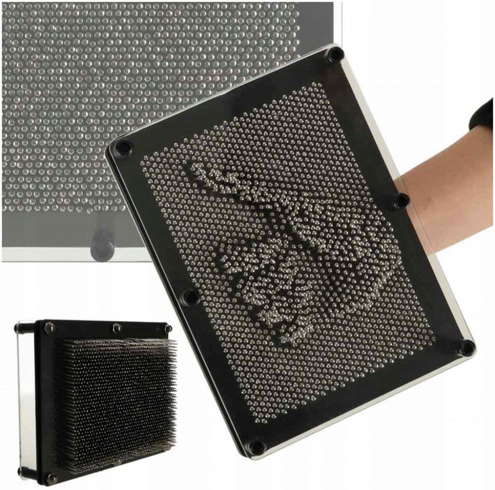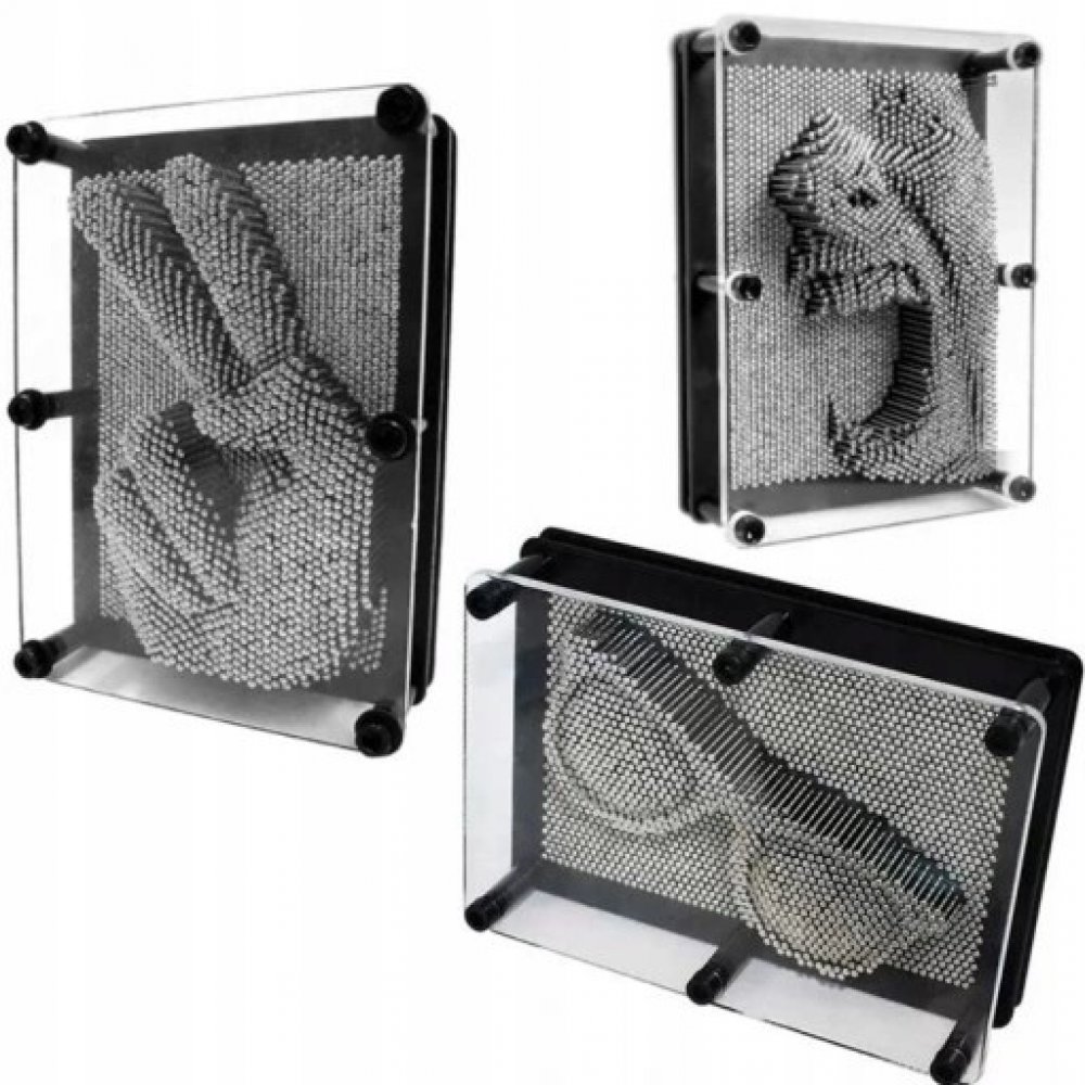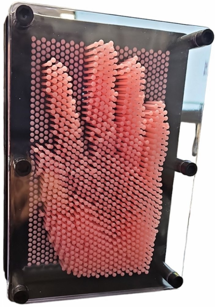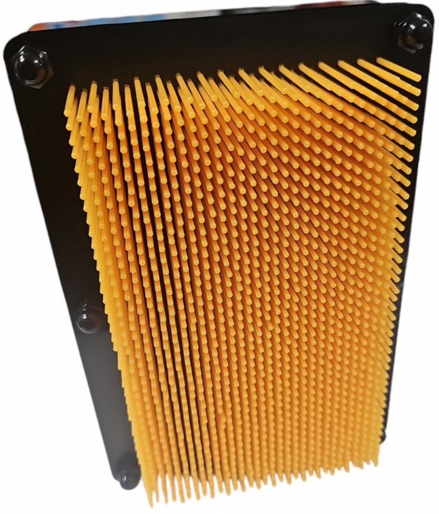 V rámečku je umístěno téměř 1000 plastových kolíků, které plasticky ztvárňují tvar přiložený k druhé straně rámečku a zachovávají si tento trojrozměrný obraz, dokud nenakloníme celek.