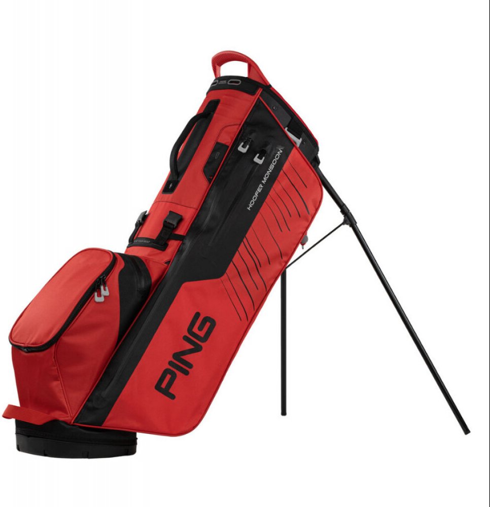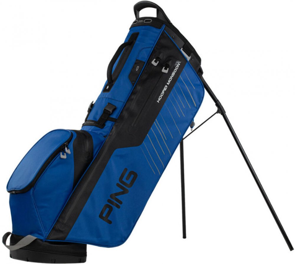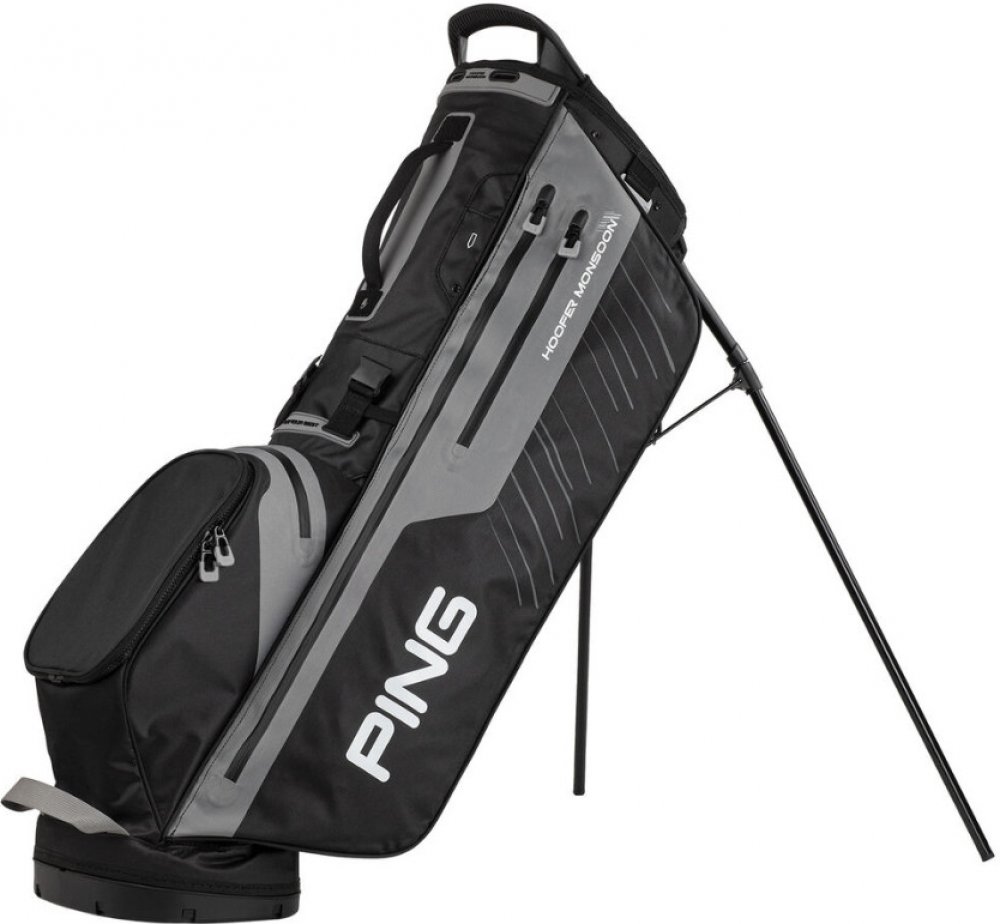 Nový lehký stand bag s nožičkami Ping Hoofer Monsoon 231, určený pro nošení na zádech, vhodný do deštivého počasí.